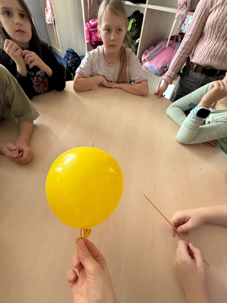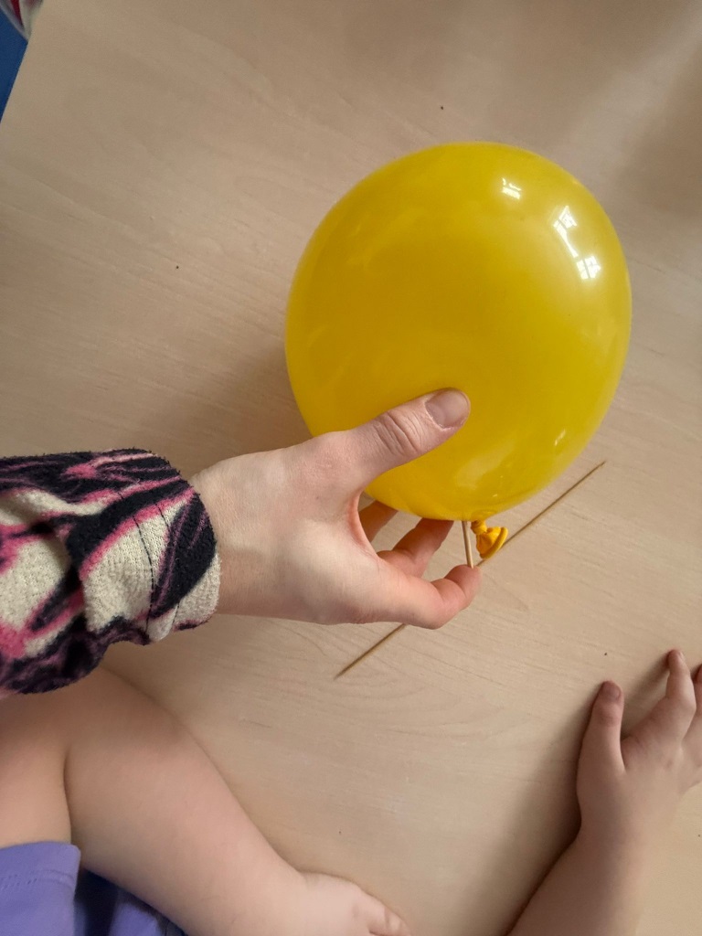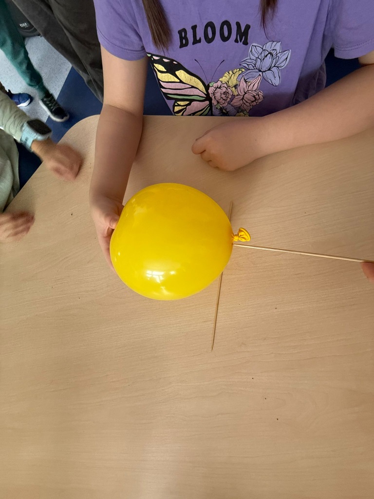 Eksperyment z balonem - balon został nadmuchany do takiej wielkości aby nie był za bardzo naprężony . Wykałaczkę włożyliśmy w miejscu gdzie jest najmniejsze napięcie -u dołu tuż po przy węzełku tam guma jest najmniej rozciągnięta i najgrubsza -u góry tam gdzie jest najciemniejsza plama gumy , miejsce to nie jest tak rozciągnięte jak boki Lateks jest polimerem, który składa się z długich, elastycznych łańcuchów cząsteczek. Gdy przebijamy balon w odpowiednim miejscu, guma rozciąga się wokół wykałaczki, uszczelniając otwór, zamiast się rozrywać.