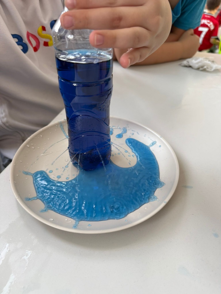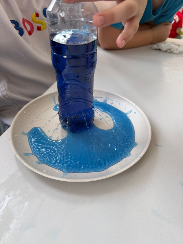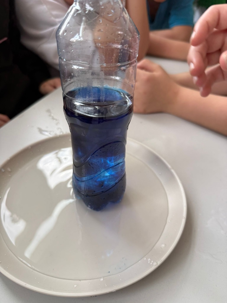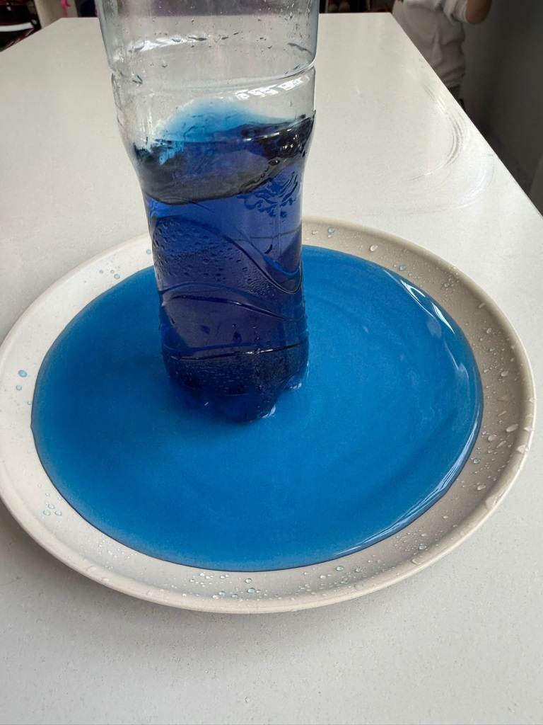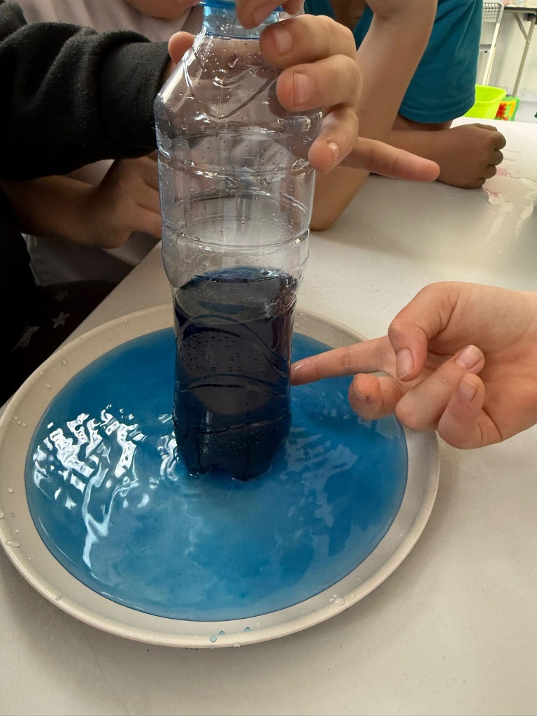 Wykonaliśmy w butelce kilka dziurek . Gdy butelka z dziurą jest zakręcona, woda nie wypływa, ponieważ ciśnienie atmosferyczne na zewnątrz jest wyższe niż ciśnienie powietrza wewnątrz. Odkręcenie zakrętki wpuszcza powietrze, zwiększa ciśnienie wewnątrz i woda zaczyna wypływać.