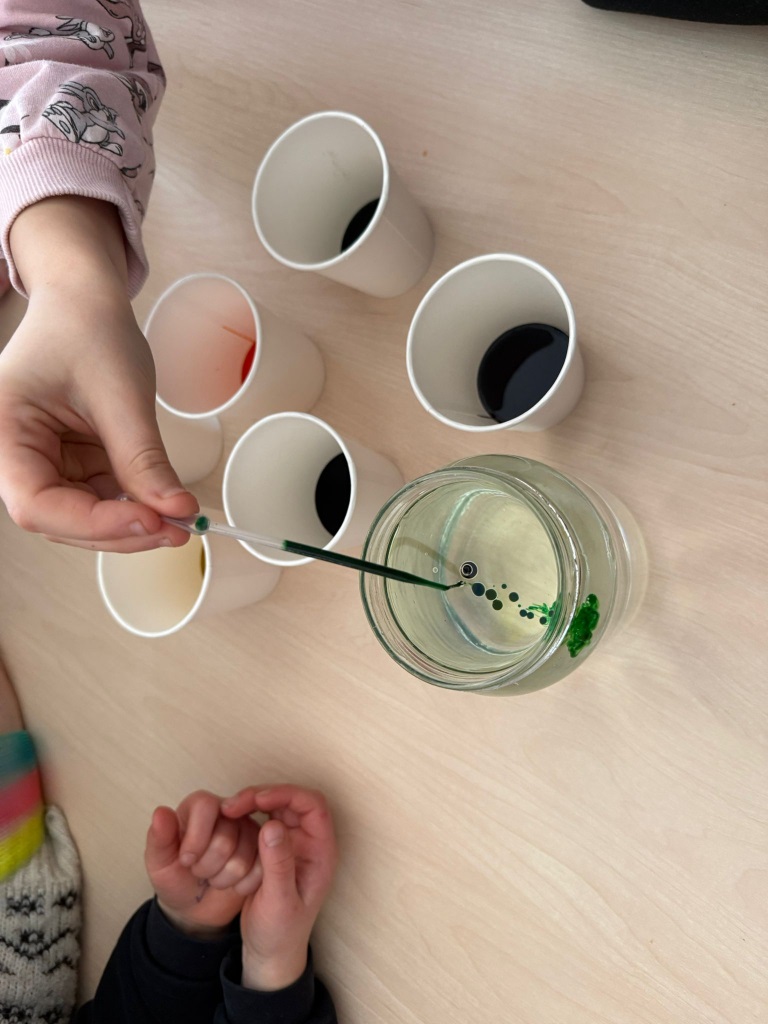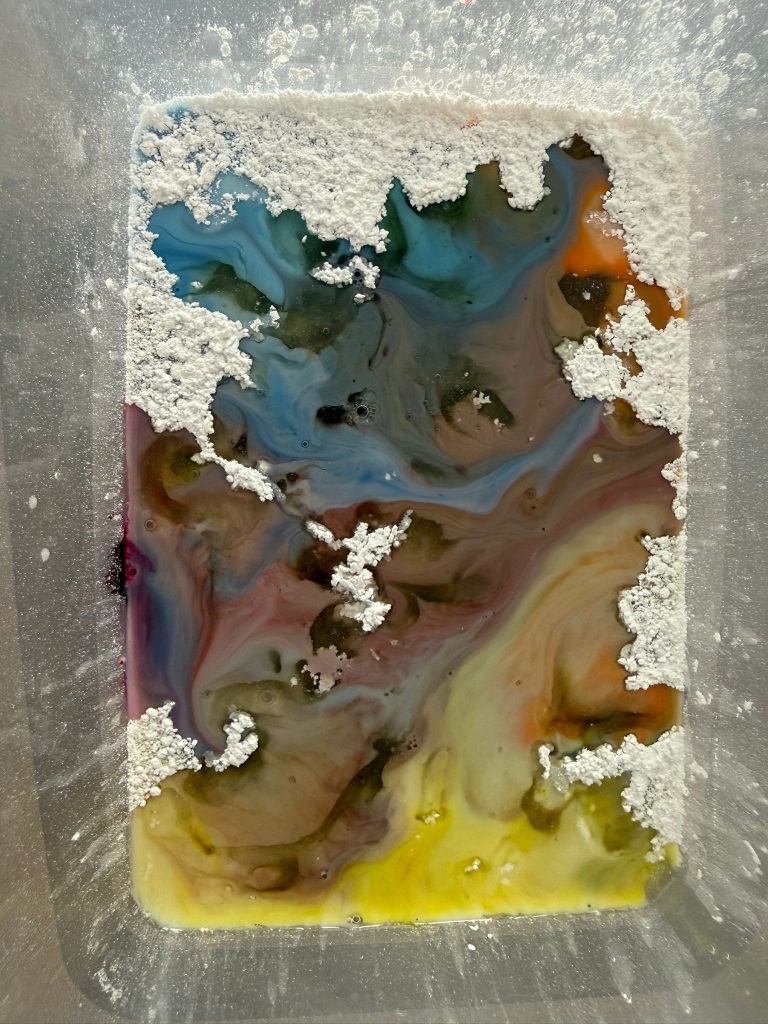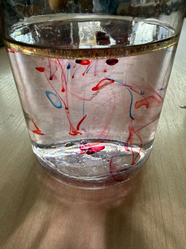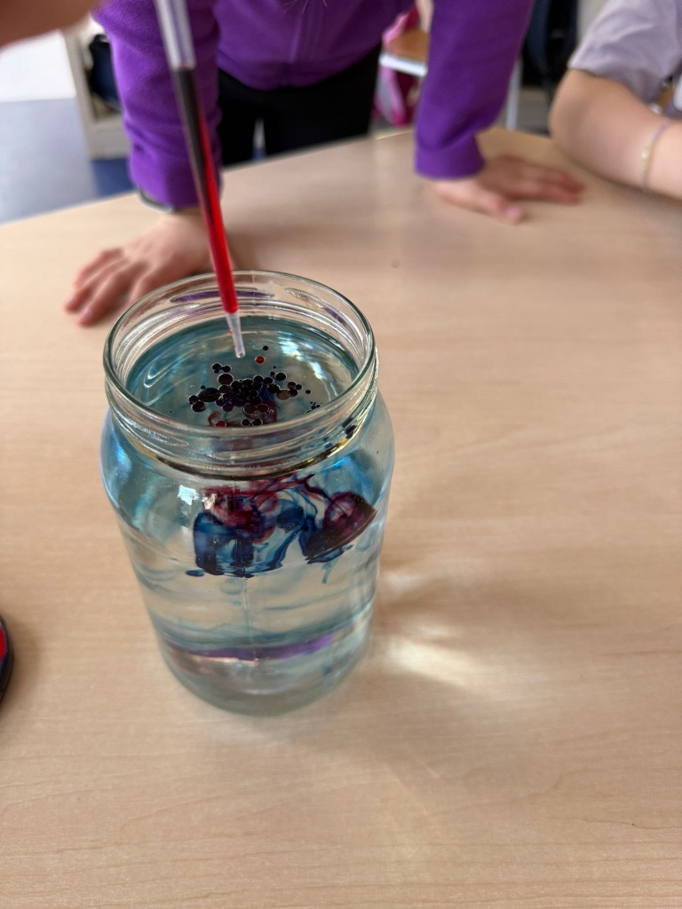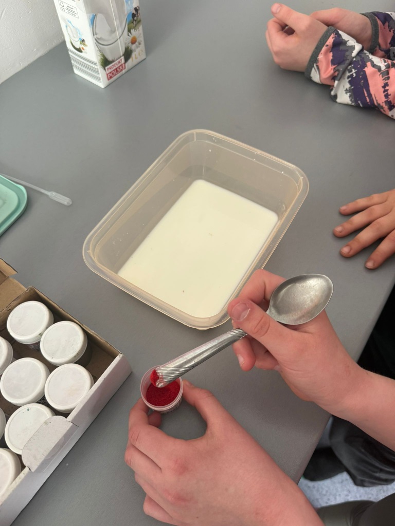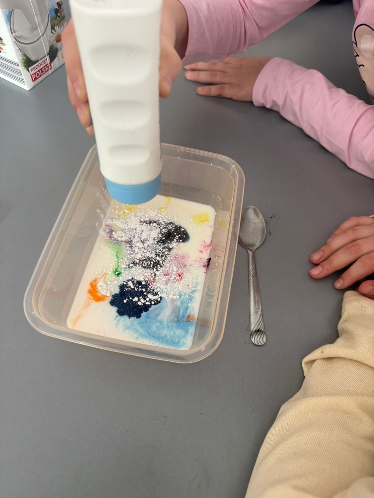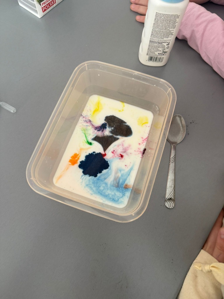 24.03. Eksperyment pokazuje różnice napięć powierzchniowych . Do miski wlaliśmy mleko 3.2 dodaliśmy barwniki spożywcze a następnie puder sypki oraz płyn do naczyń Tłuste mleko ma w sobie tłuszcz które boi się detergentu i ucieka od niego ponieważ rozbija cząsteczki tłuszczu . Barwniki rozprzestrzeniają się tworząc mozaikę