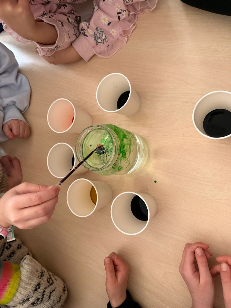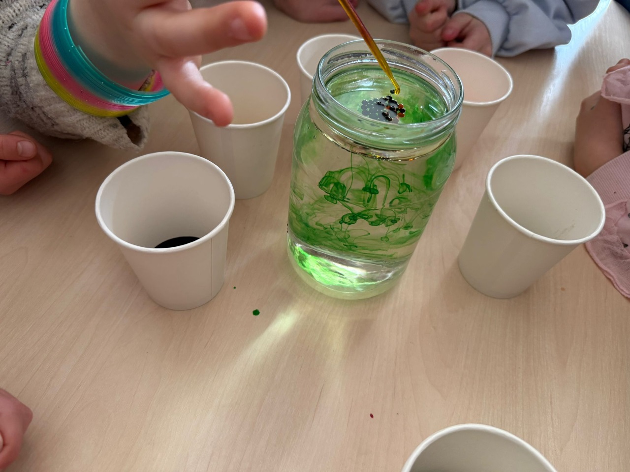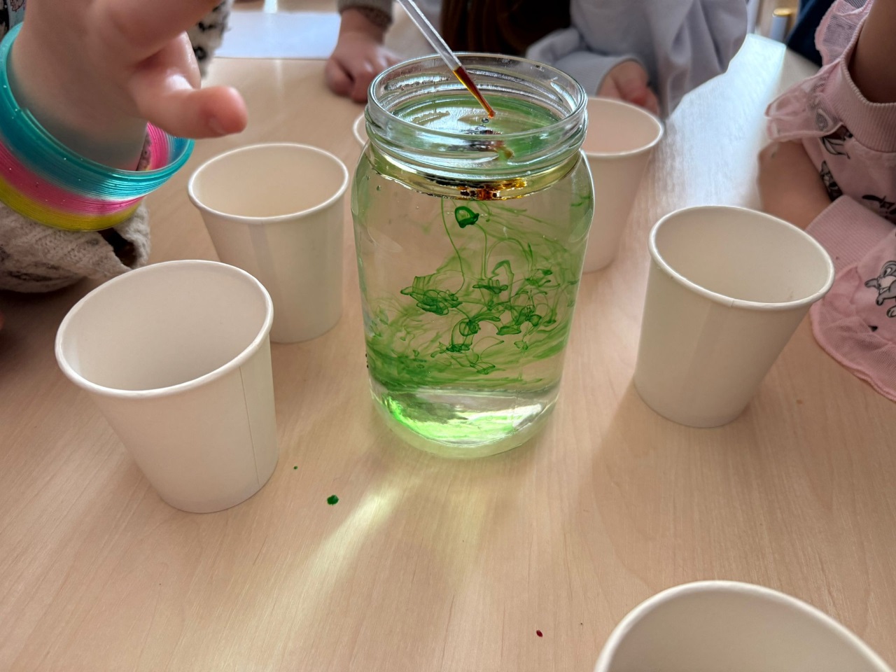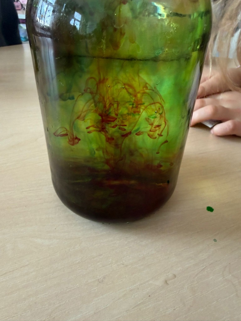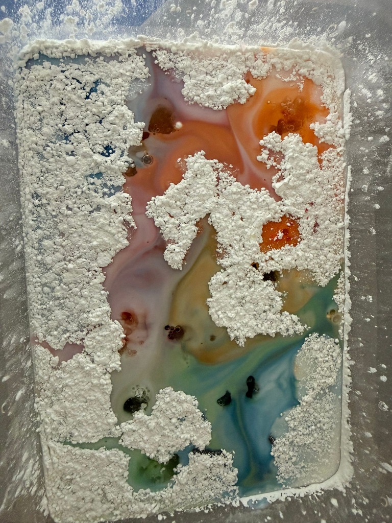 24.03. Eksperyment pokazuje różnice napięć powierzchniowych . Do miski wlaliśmy mleko 3.2 dodaliśmy barwniki spożywcze a następnie puder sypki oraz płyn do naczyń Tłuste mleko ma w sobie tłuszcz które boi się detergentu i ucieka od niego ponieważ rozbija cząsteczki tłuszczu . Barwniki rozprzestrzeniają się tworząc mozaikę
