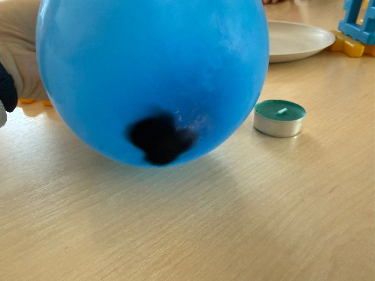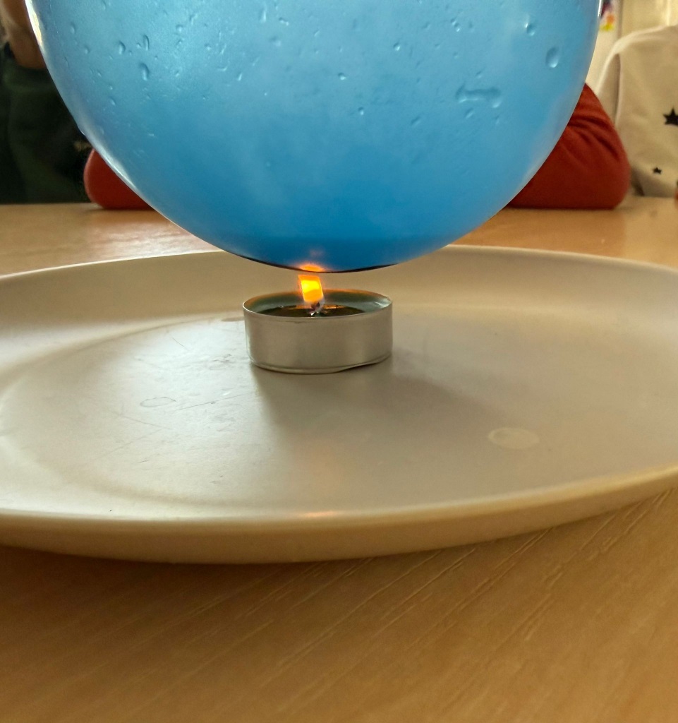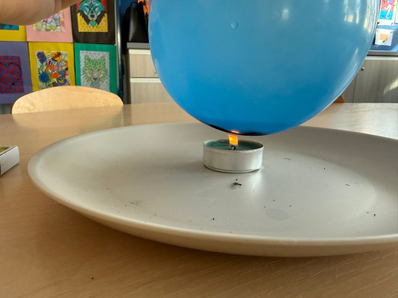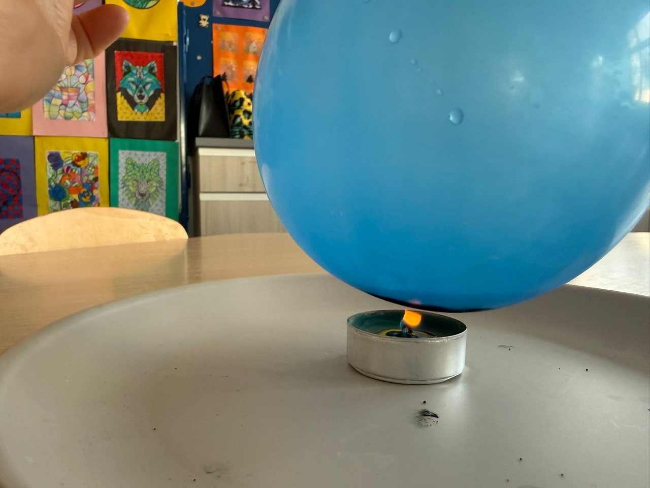 [25.03] Do balonu wlaliśmy trochę wody napełniliśmy powietrzem i umieszczamy nad płomieniem . Woreczek nie pęka! Dlaczego? Sekret tkwi w pojemności cieplnej wody , która jest 4 razy większa niż pojemność cieplna powietrza . Oznacza to że woda może pochłonąć 4 razy więcej ciepła. Dodatkowo zachodzi konwekcja . Ciepła woda idzie do góry a zimna woda zajmuje jej miejsce , chłodząc ścianki balonu . Woda jest świetnym przewodnikiem ciepła.