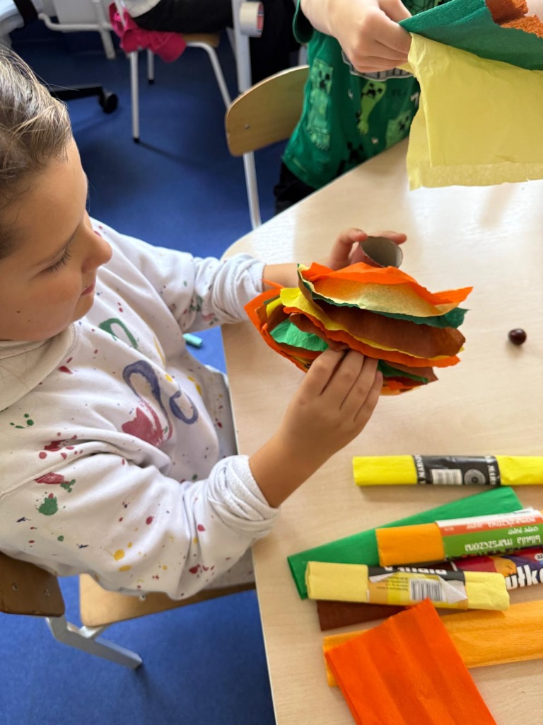10 października obchodziliśmy Dzień Drzewa. Uczniowie poznali różnice między drzewem i krzewem. Oglądaliśmy atlasy, w których sfotografowane były drzewa z owocami oraz rozpoznawaliśmy nazwy gatunków drzew na podstawie liści. Uczniowie wykonali prace plastyczne - papierowe drzewa.