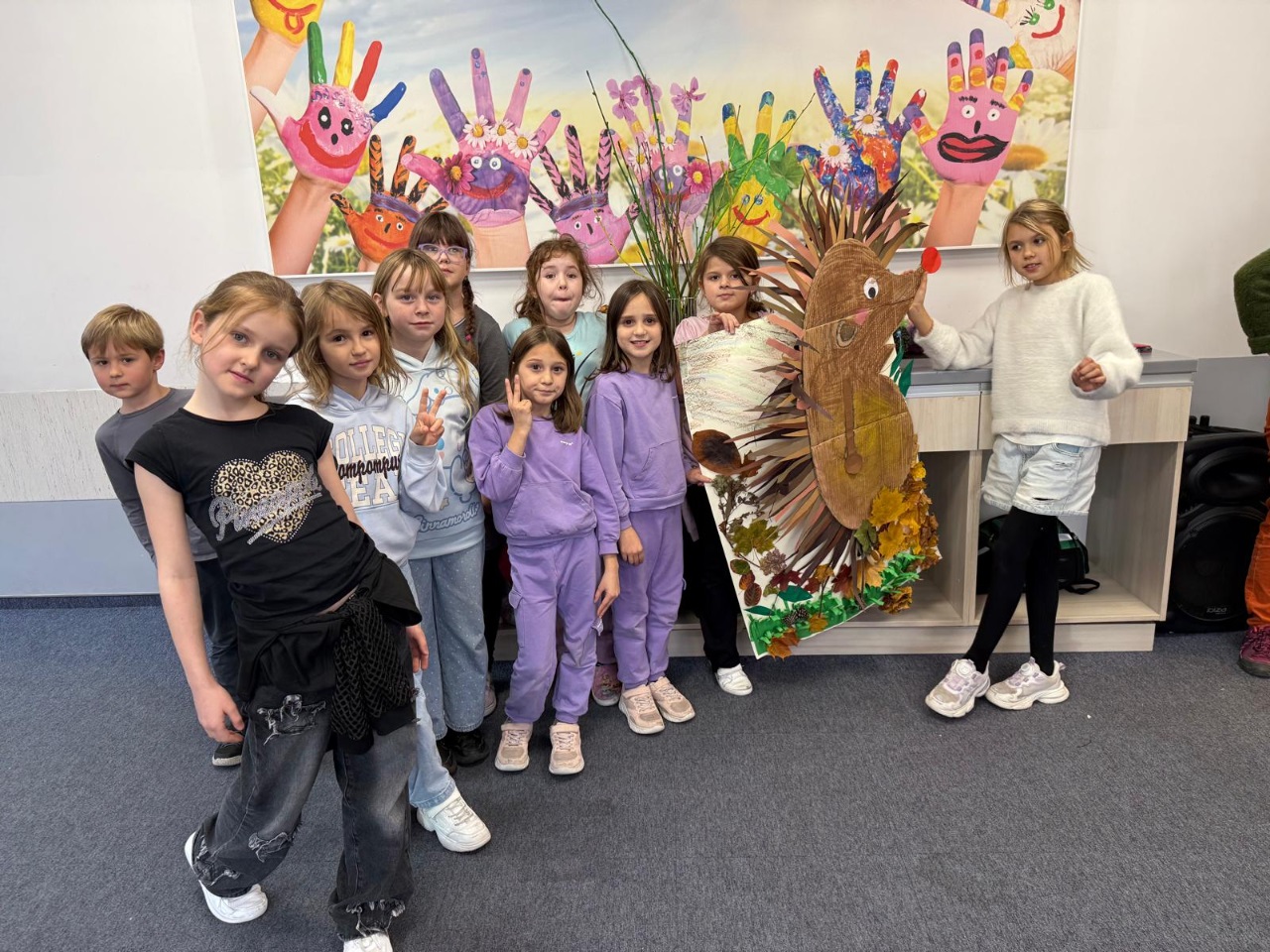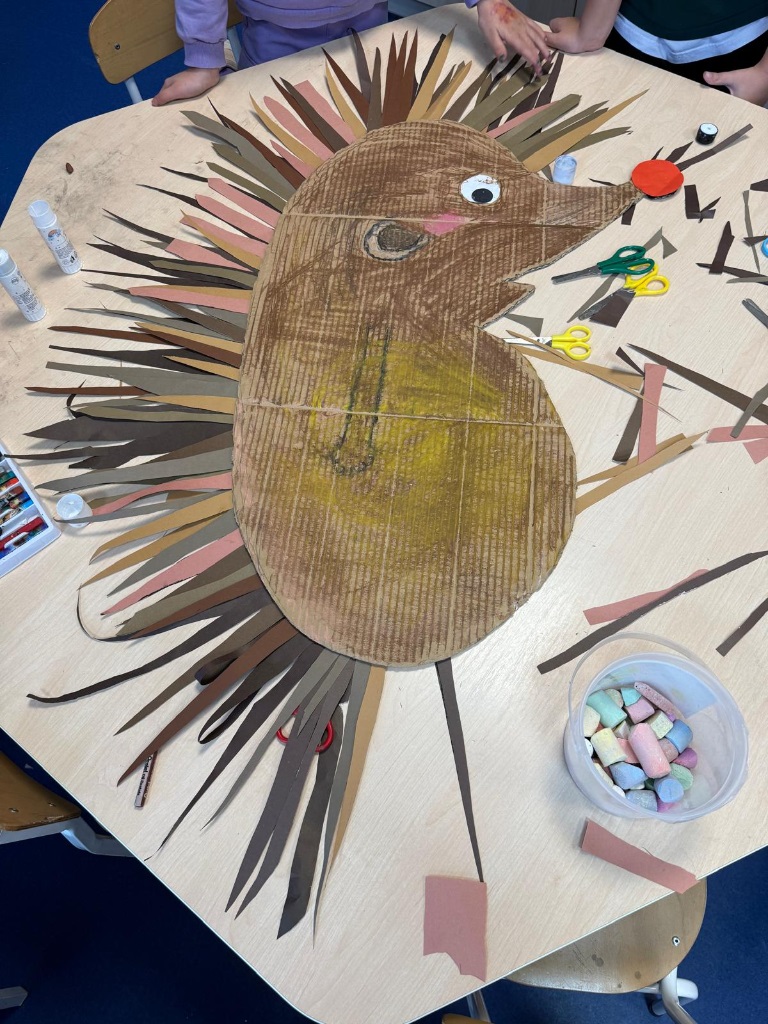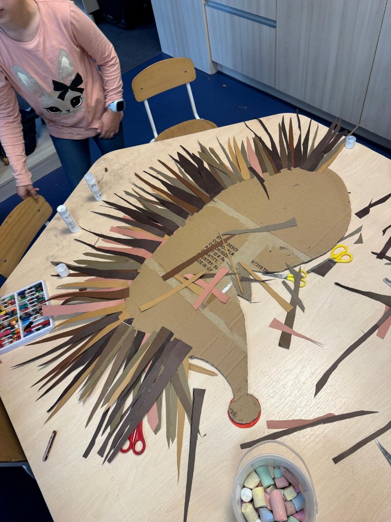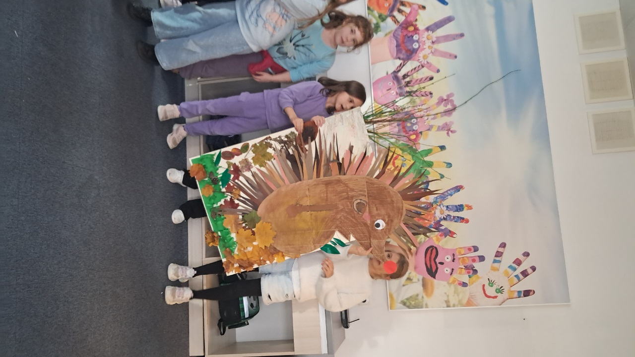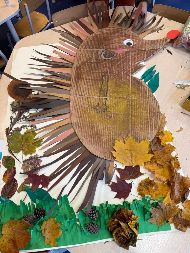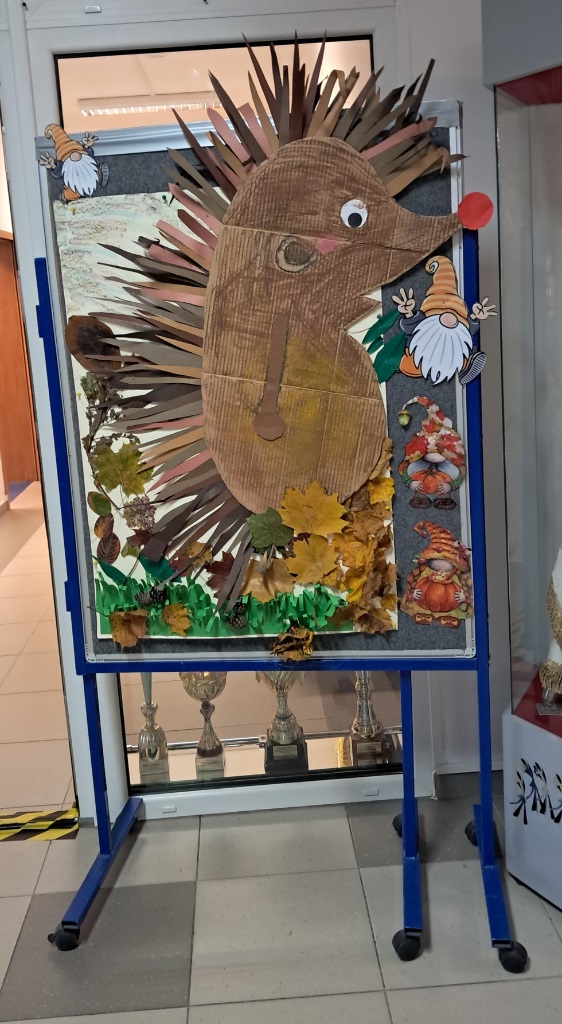 Podczas zajęć plastycznych dzieci zbiorowo wykonały dużego jeża, który jest jesienną ozdobą na naszym szkolnym korytarzu.