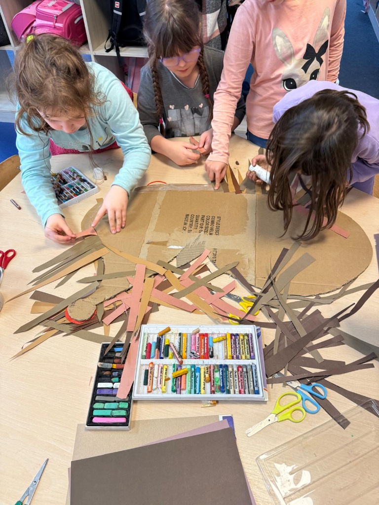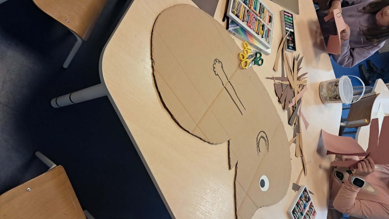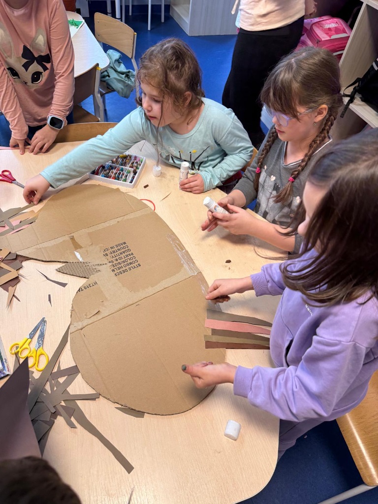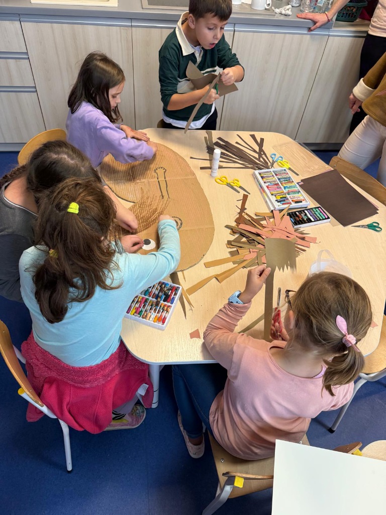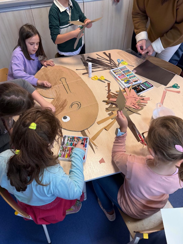 Podczas zajęć plastycznych dzieci zbiorowo wykonały dużego jeża, który jest jesienną ozdobą na naszym szkolnym korytarzu.