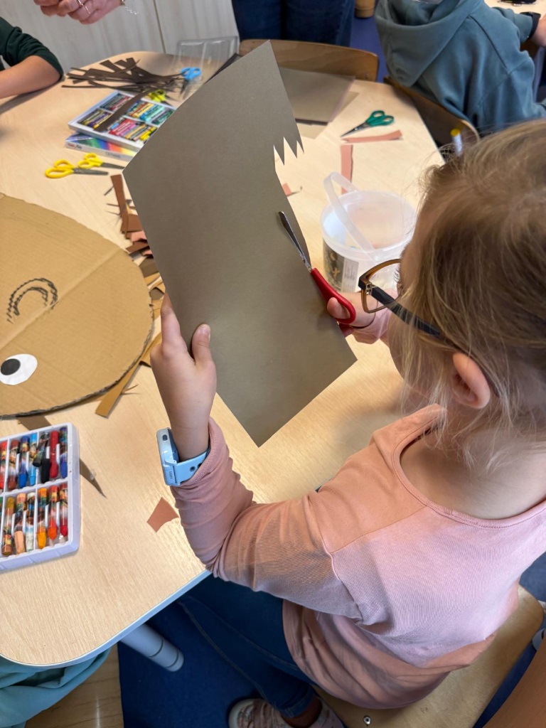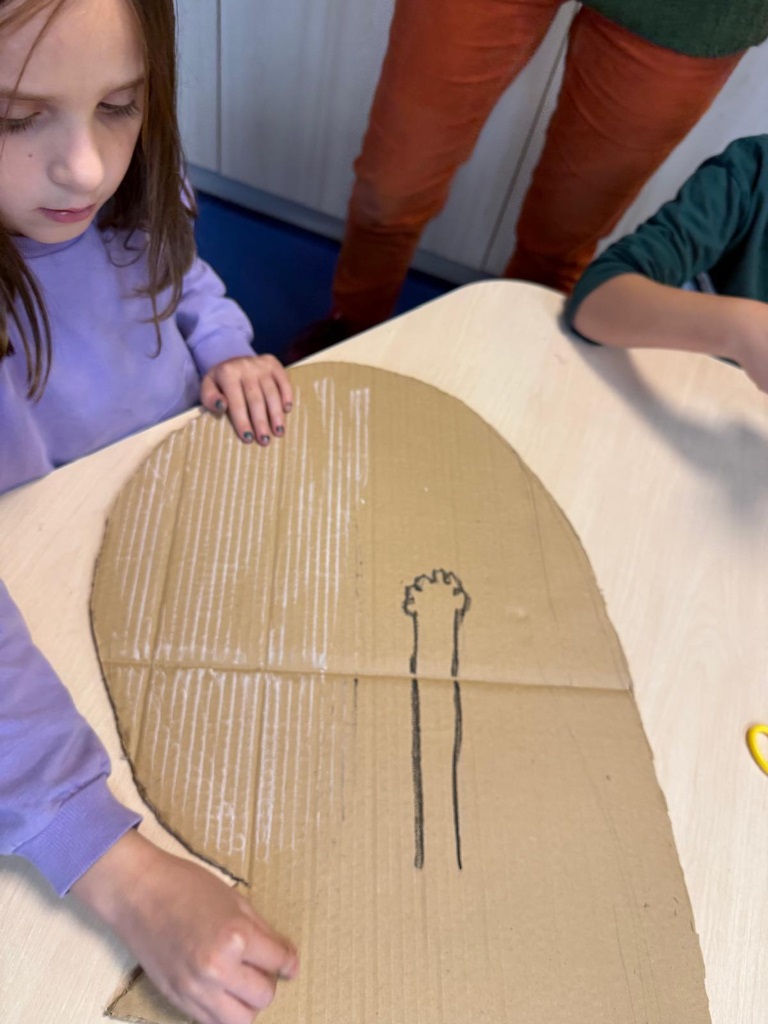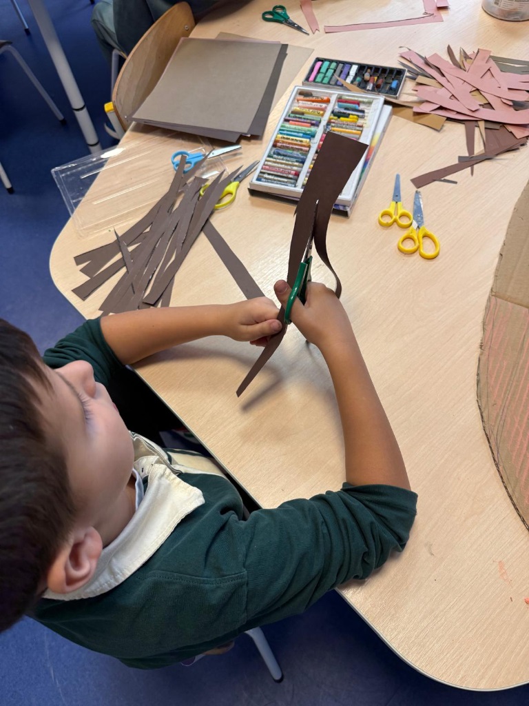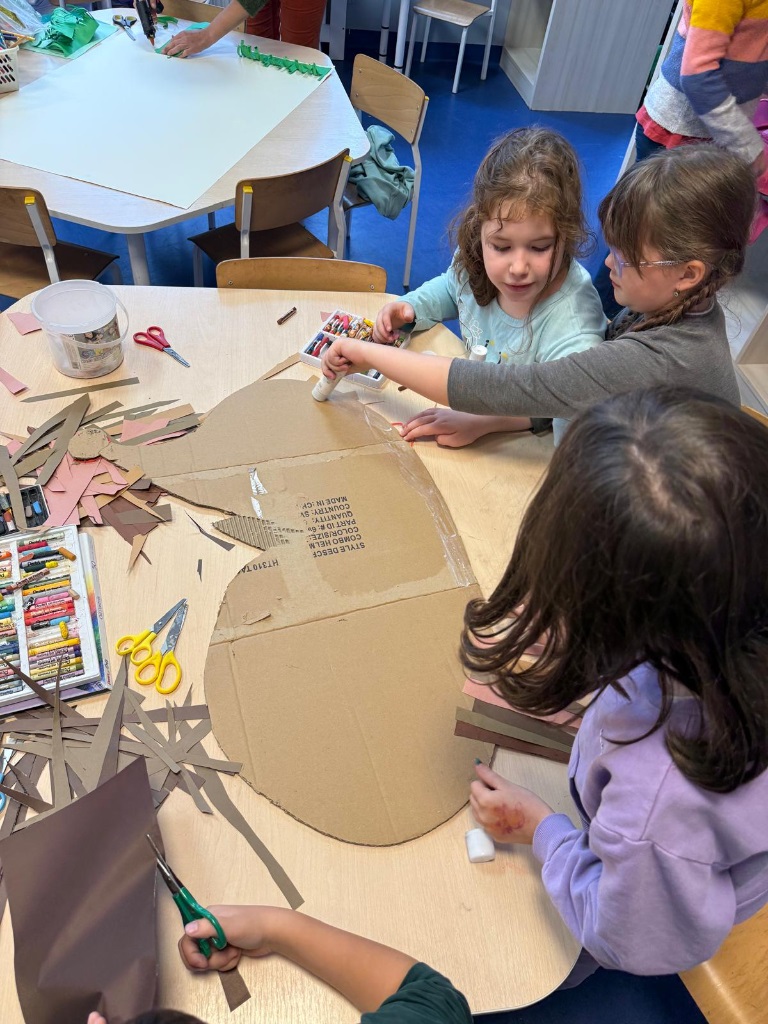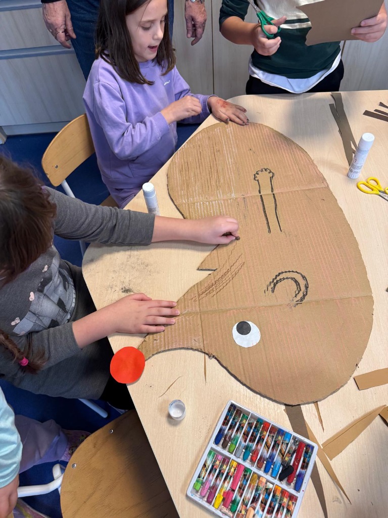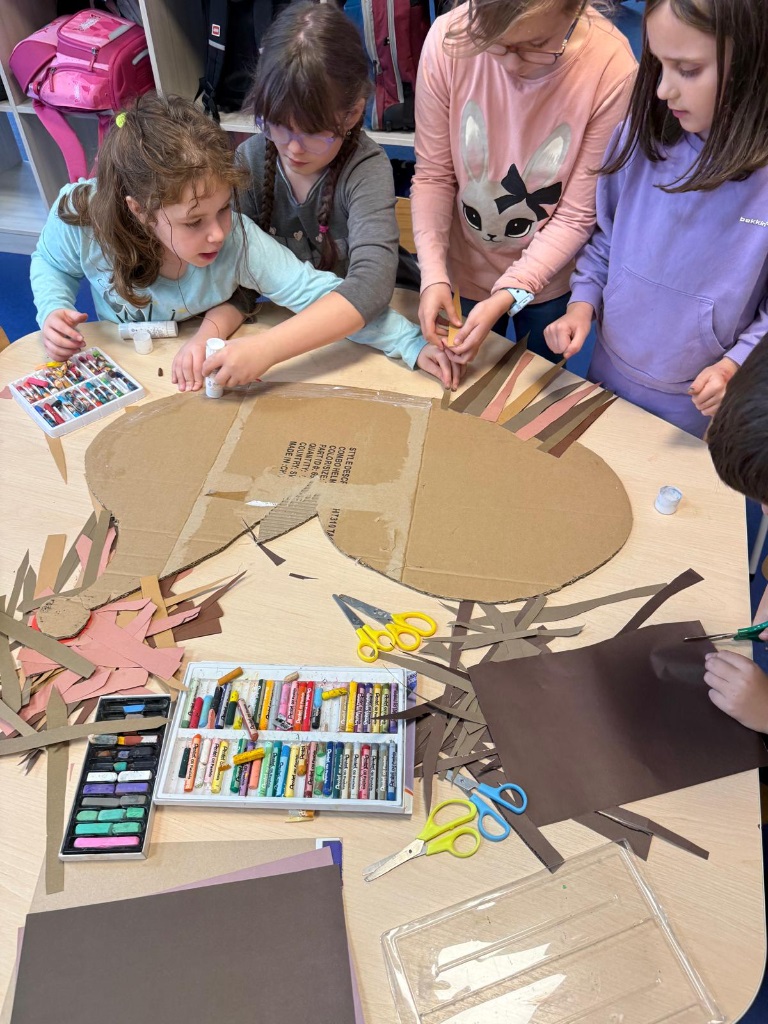 Podczas zajęć plastycznych dzieci zbiorowo wykonały dużego jeża, który jest jesienną ozdobą na naszym szkolnym korytarzu.