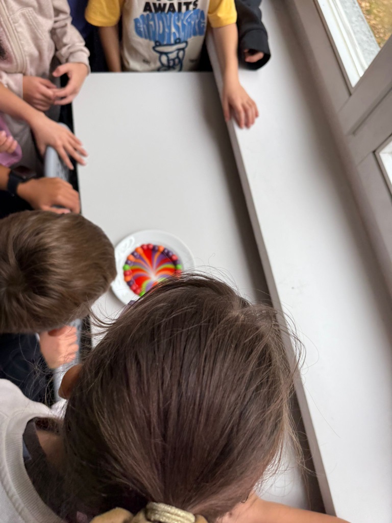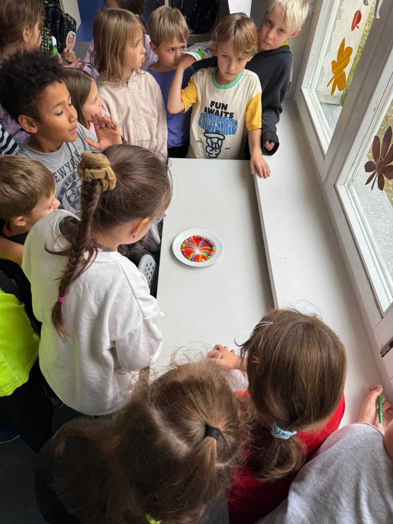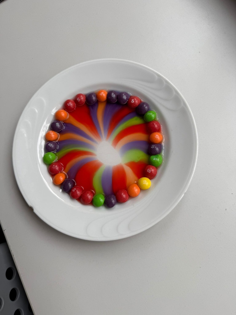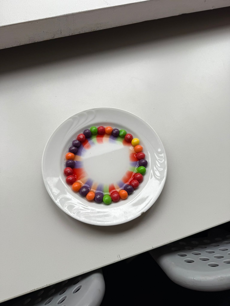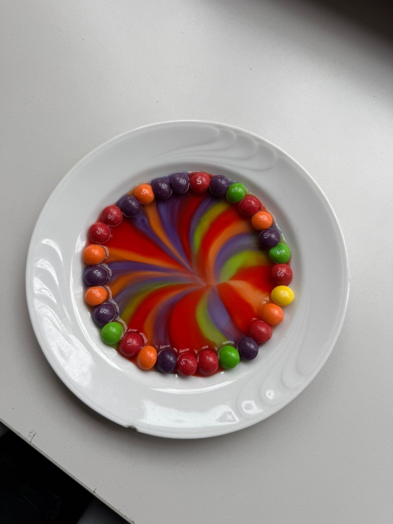 Tęcza na talerzu: ma na celu pokazanie jak barwniki rozpuszczają się po podaniu wody tworząc smugi.