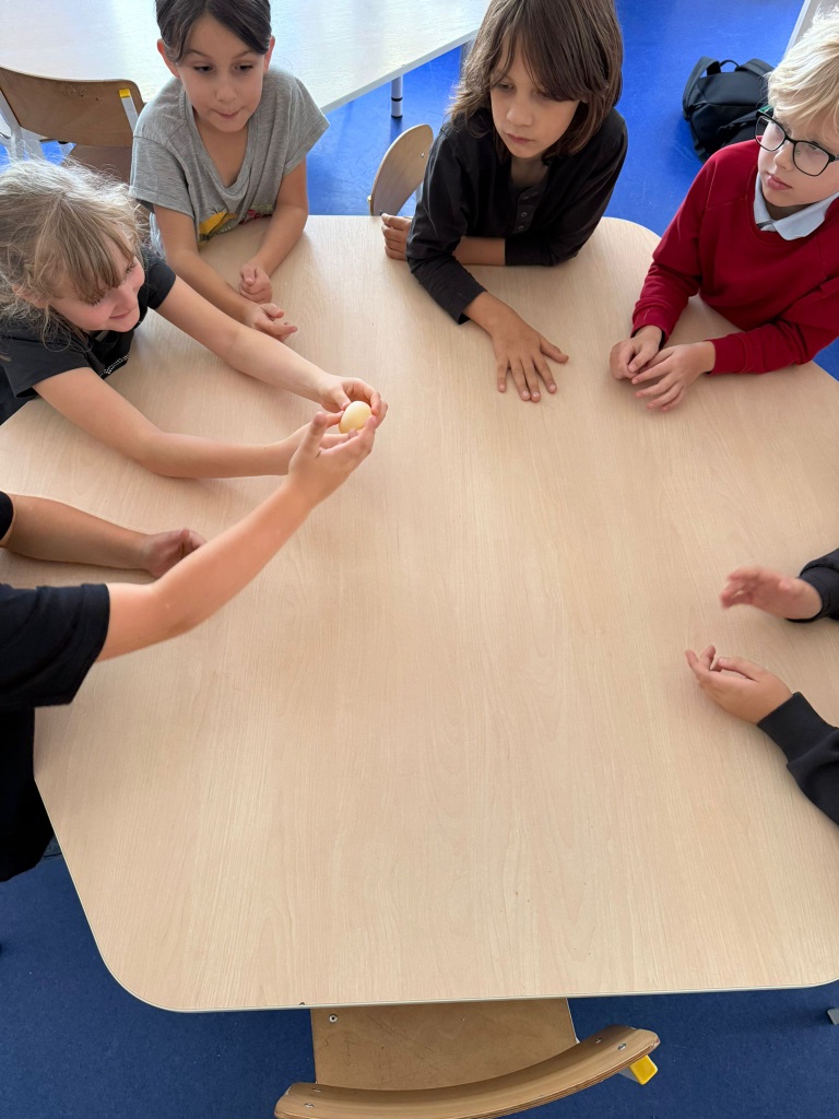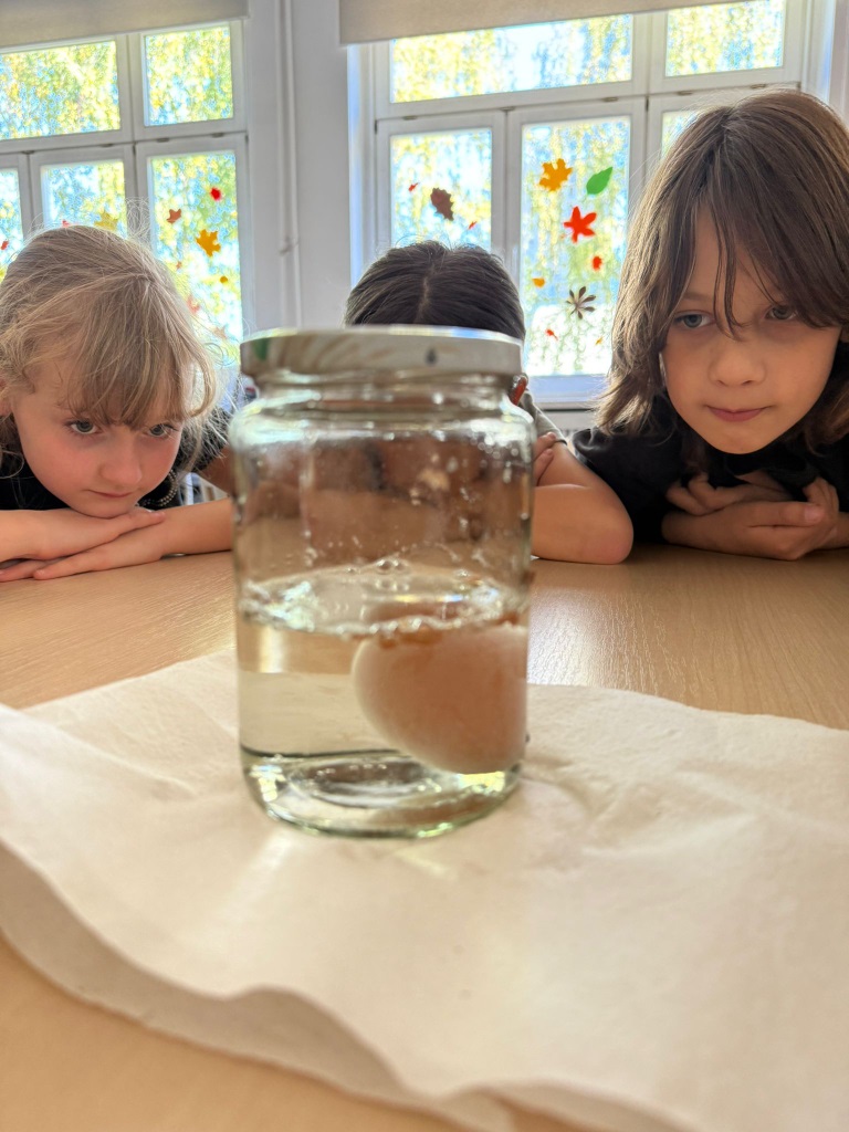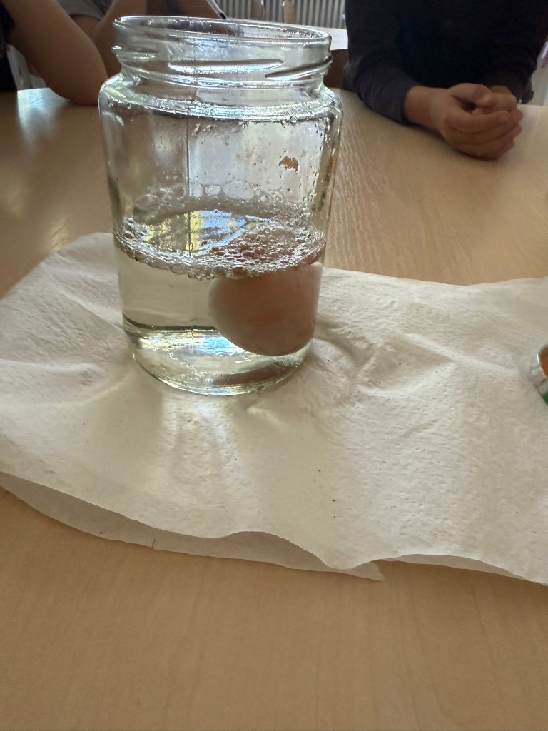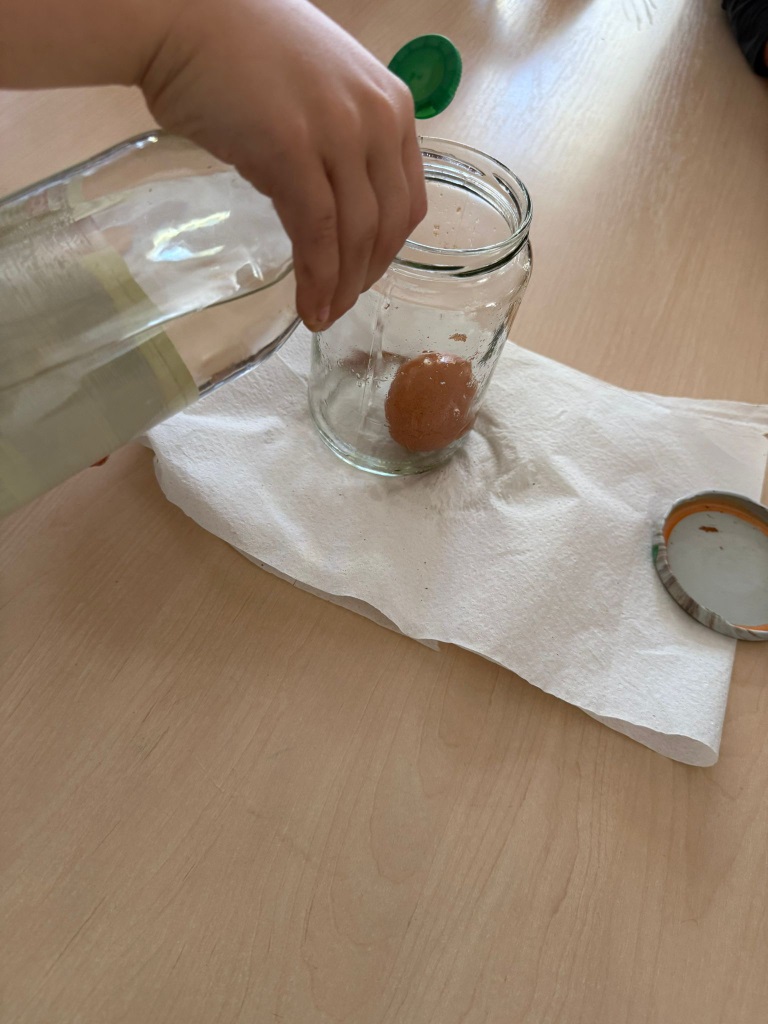 Skaczące jajko: surowe jajko w słoiku zanurzone w occie na 24h. W trakcie reakcji chemicznej węglan wapnia ze skorupki jajka rozpuszcza się pozostawiając jedynie elastyczną błonę pod spodem.