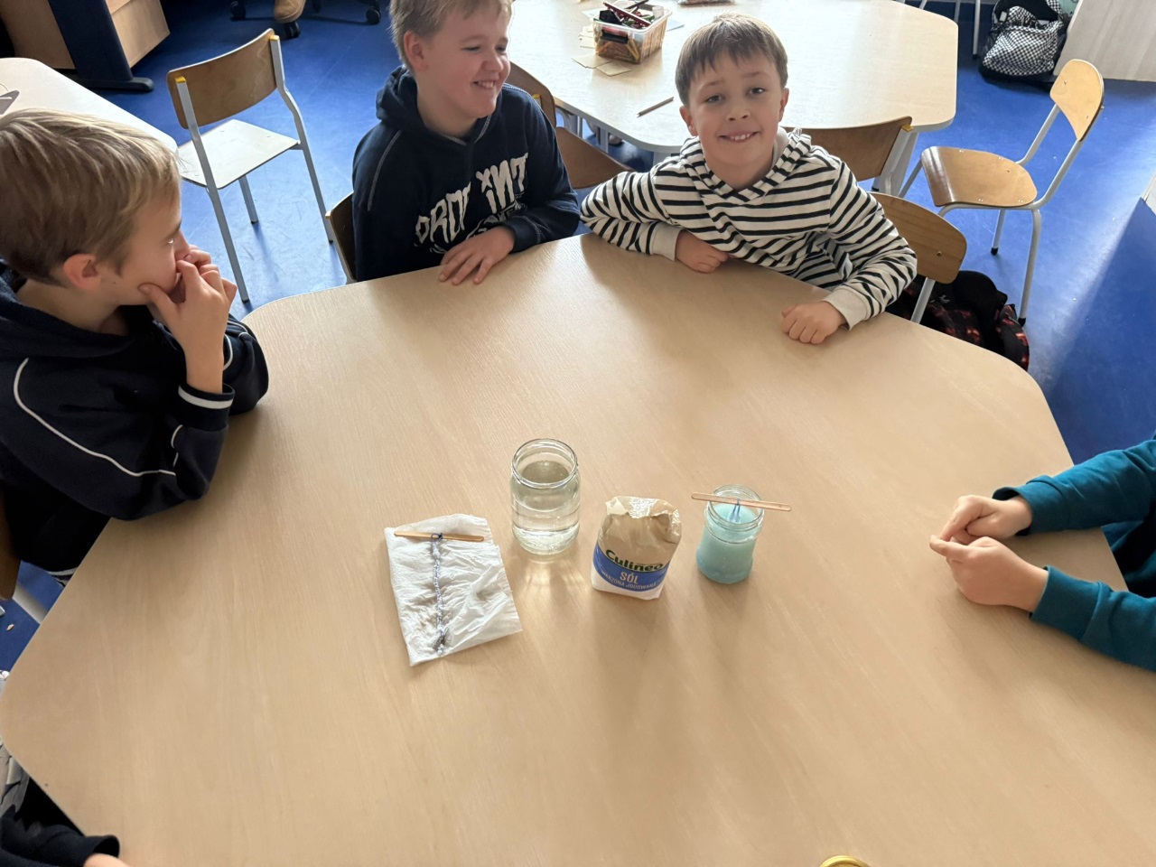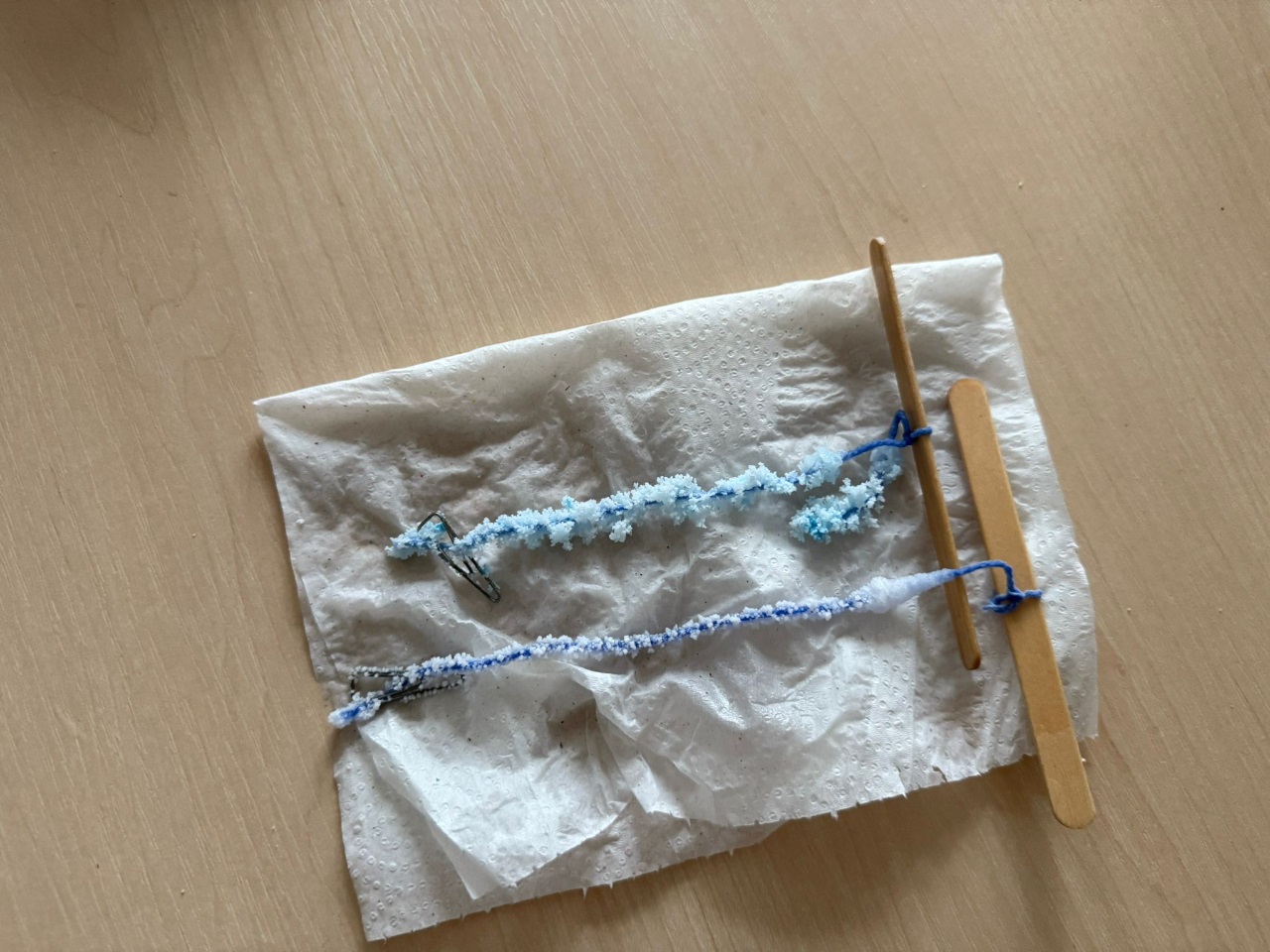 - Krystalizacja soli: do ciepłej wody wrzucamy taką ilość soli aż osiągniemy roztwór nasycony - sól przestanie się rozpuszczać.Na środek patyczka związujemy kawałek bawełnienej nitki obciążonej spinaczem. Zanurzamy nitkę do wody. Odstawiamy słoik w suiche miejsce na kilka dni. Na nitce powstaną kryształki.