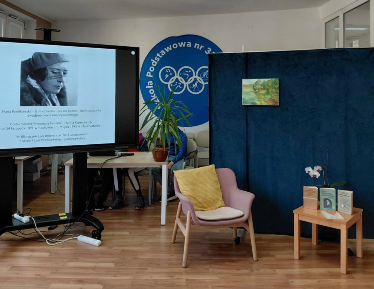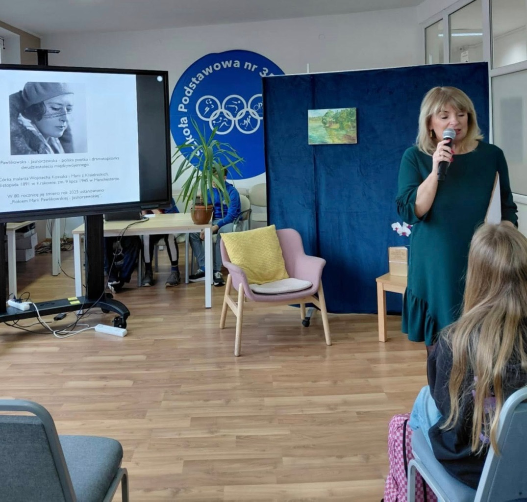 Utwory poetki przeczytała pani Dyrektor Małgorzata Skwira oraz uczennice klasy Vlla. Wysłuchaliśmy również muzycznych wersji wierszy Marii Pawlikowskiej-Jasnorzewskiej, przejmująco wykonanych przez znane polskie wokalistki - Sanah i Kasię Nosowską.