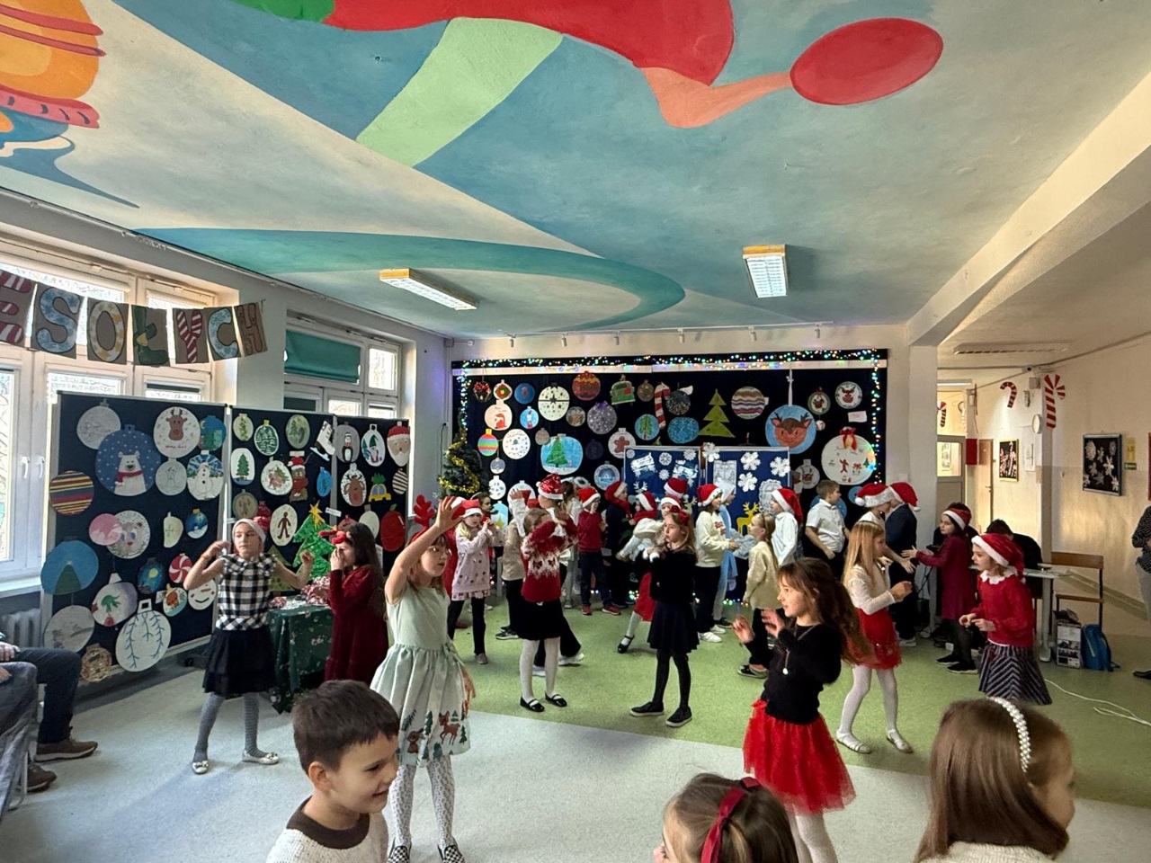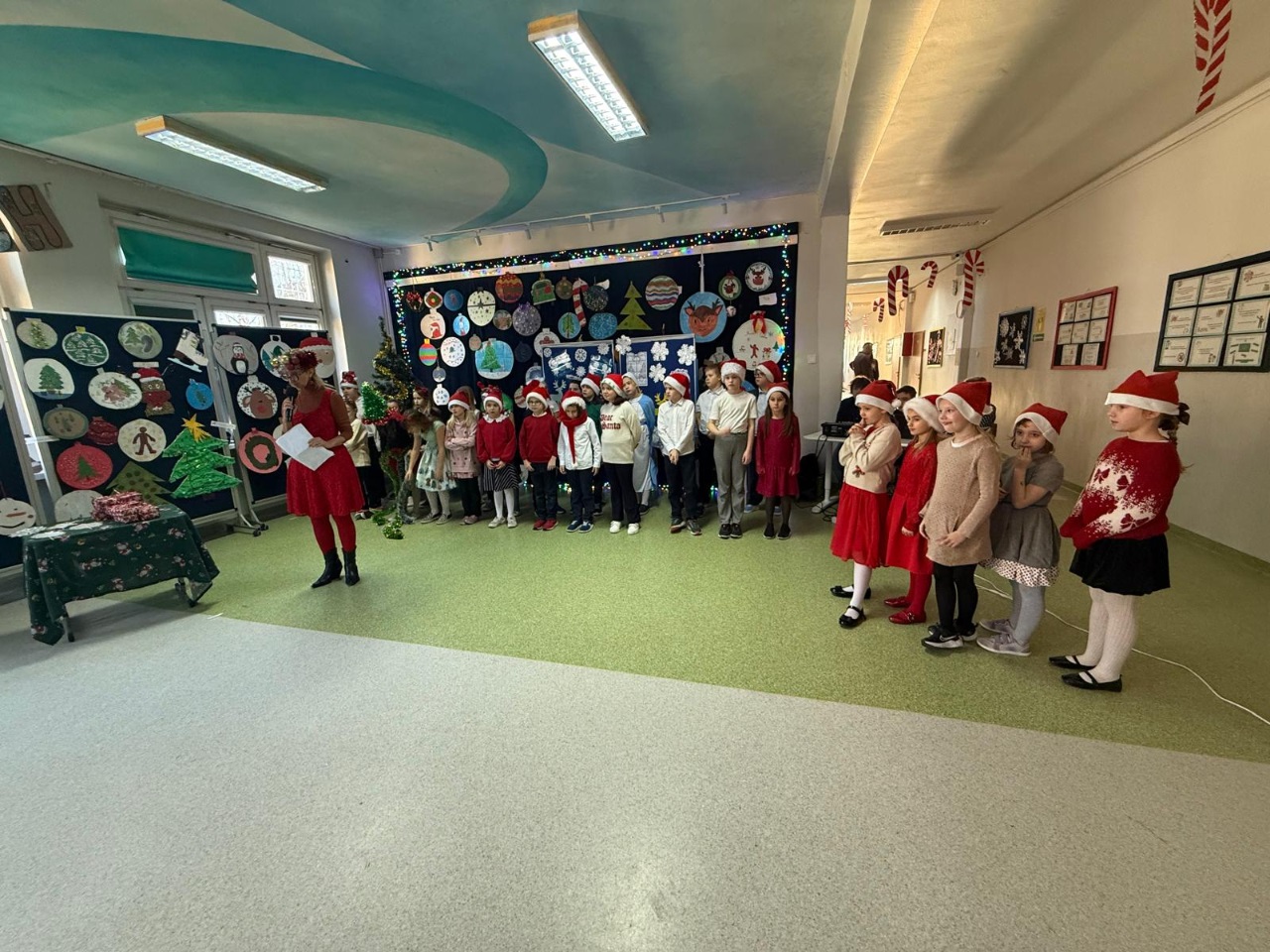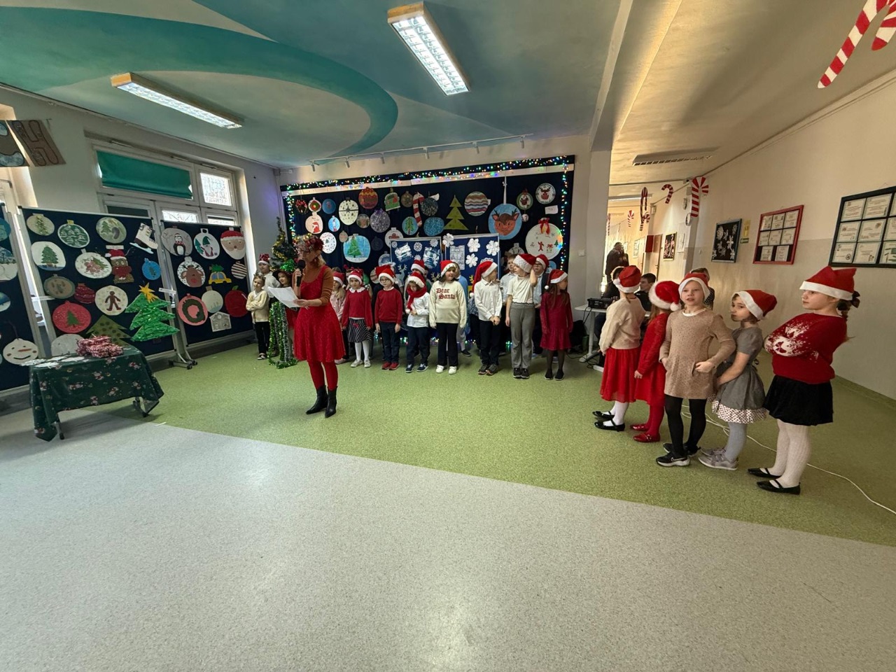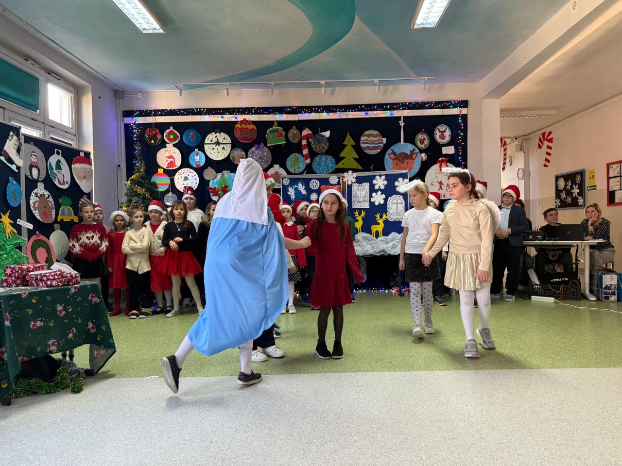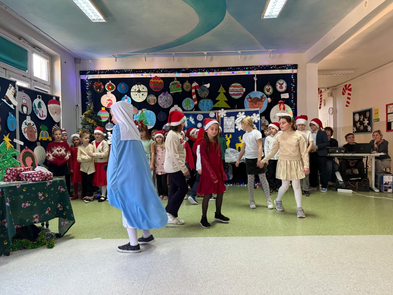 19 grudnia świetlica szkolna przygotowała piękne przedstawienie bożonarodzeniowe dla uczniów klas 1–3 oraz pracowników szkoły. Dzieci z wielkim zaangażowaniem zaprezentowały przygotowany program artystyczny – tańczyły, recytowały wiersze oraz śpiewały, wprowadzając wszystkich w radosny, świąteczny nastrój. Na zakończenie mali artyści złożyli wszystkim obecnym serdeczne życzenia bożonarodzeniowe, które spotkały się z ciepłym przyjęciem i gromkimi brawami.