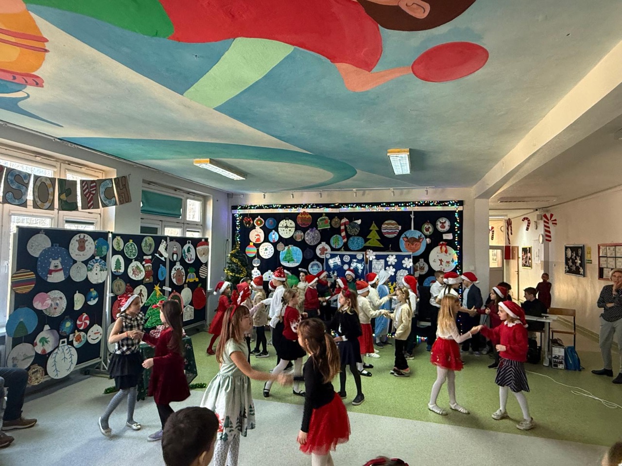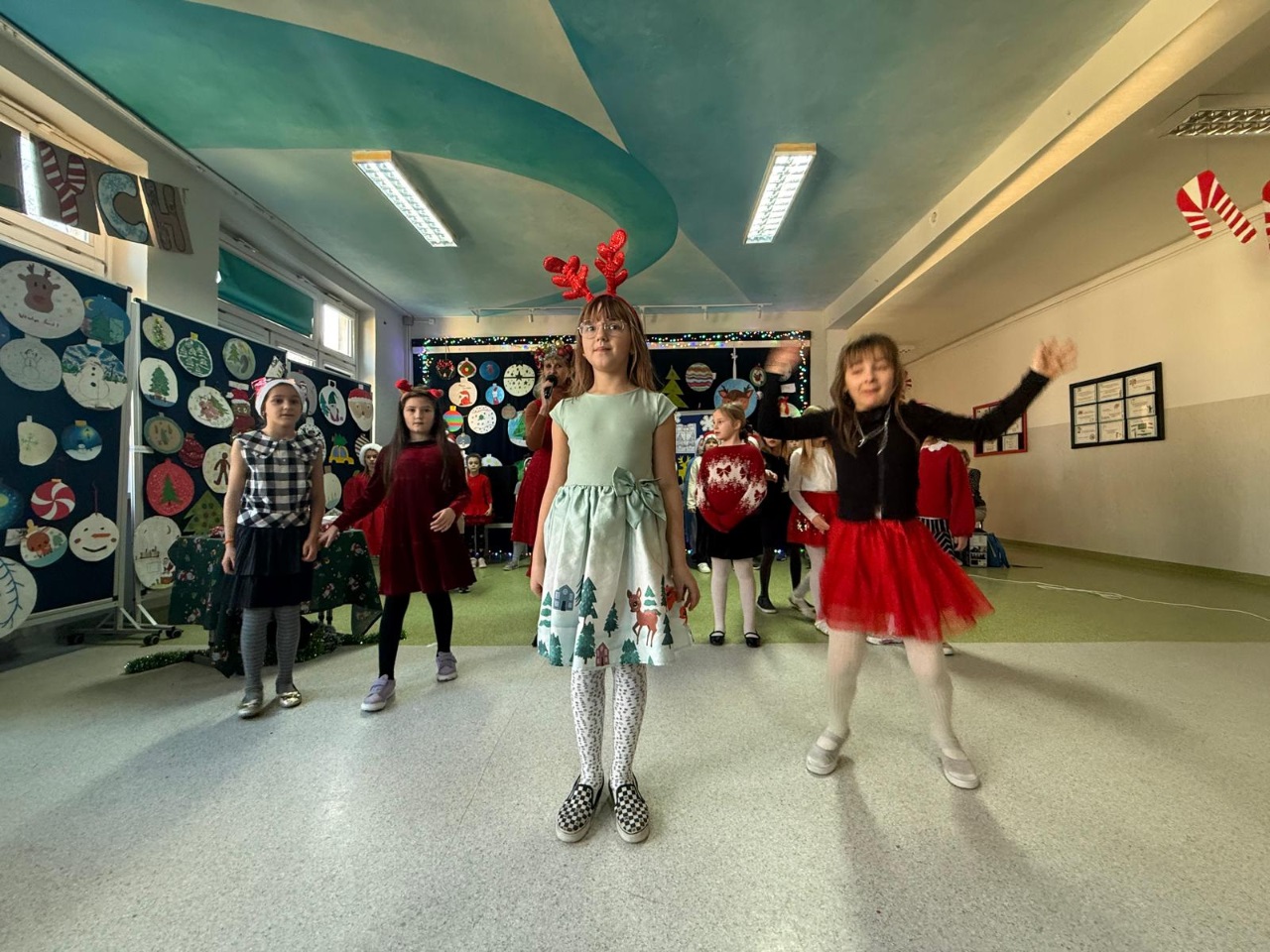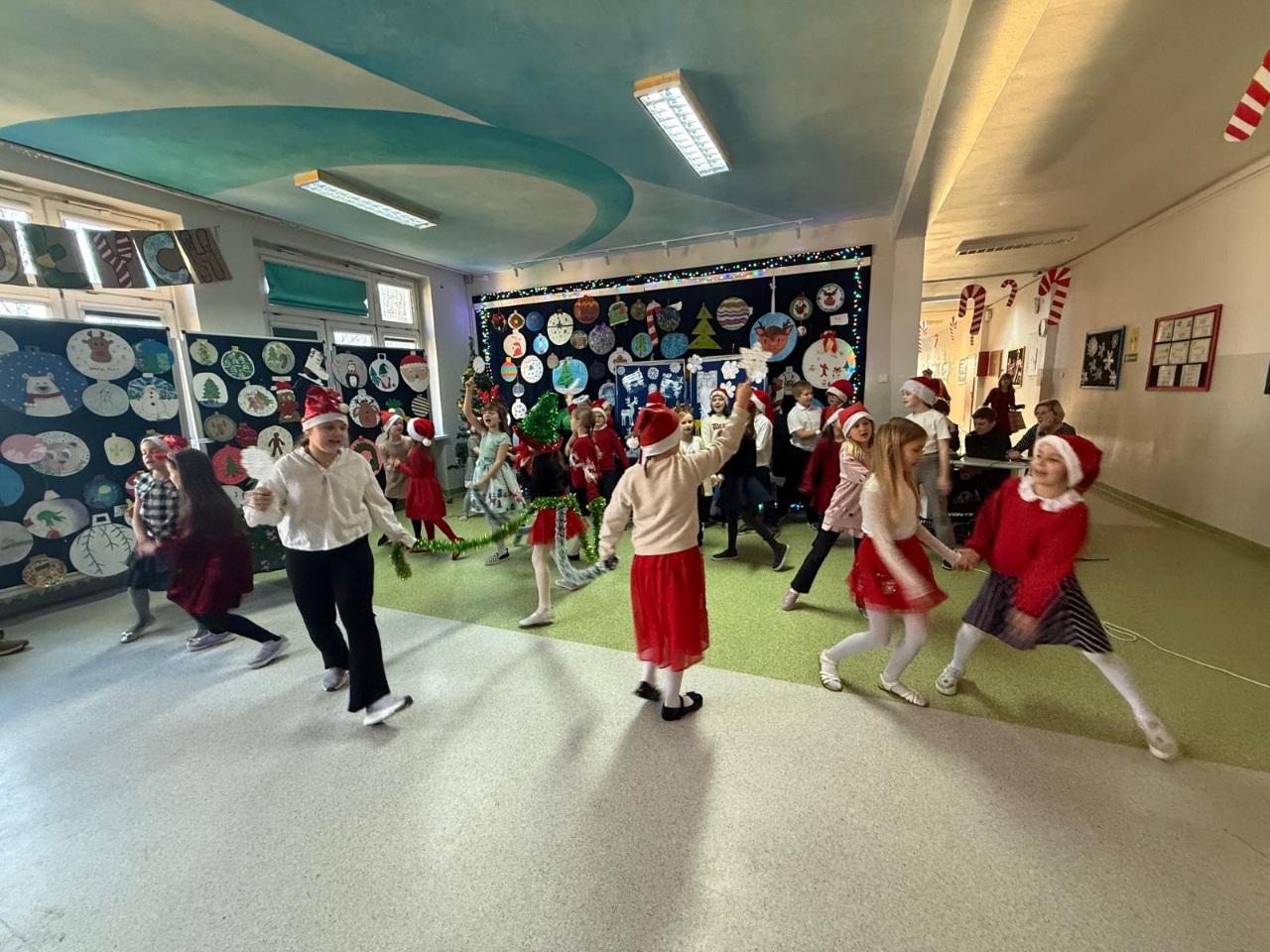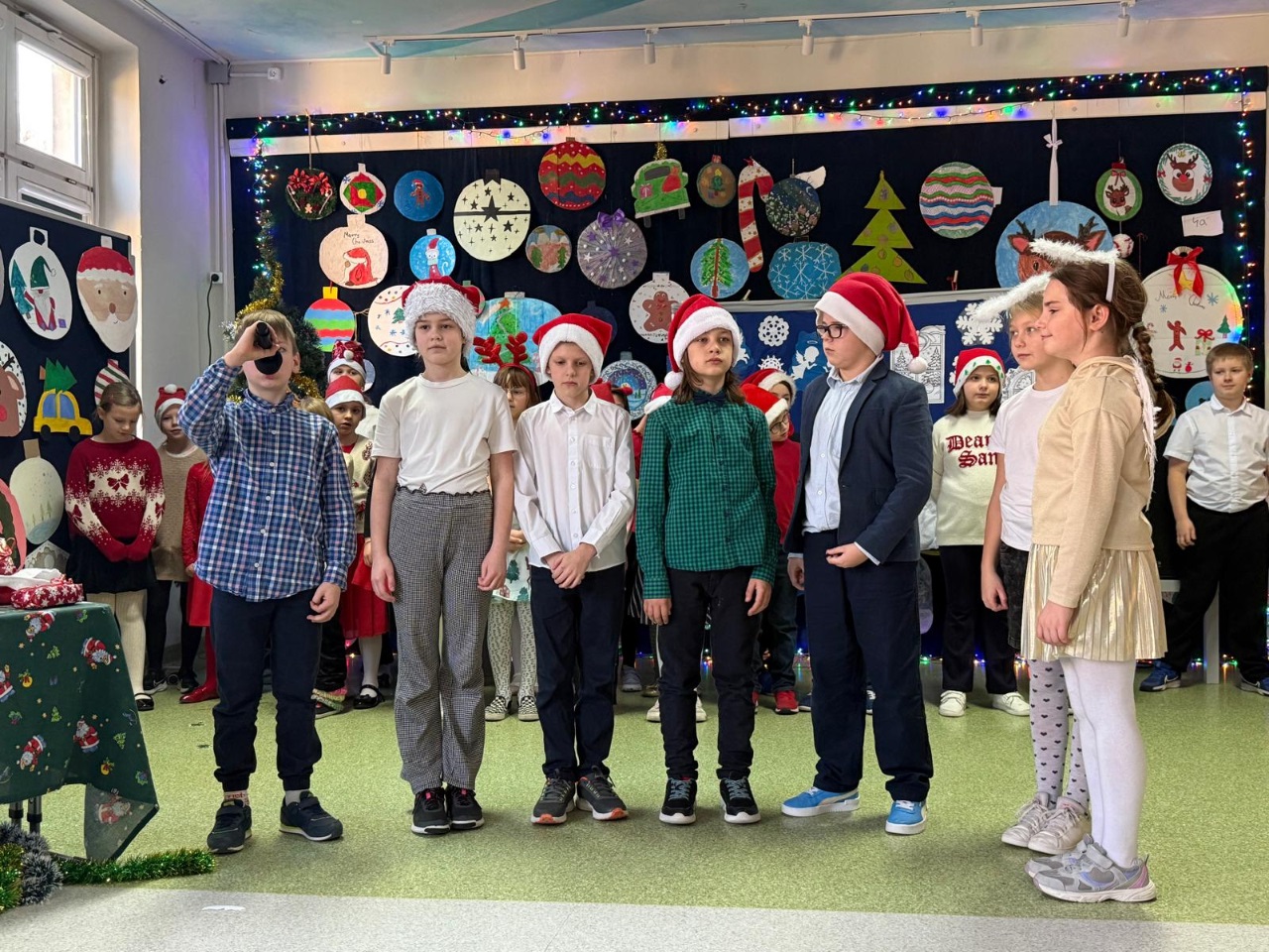 19 grudnia świetlica szkolna przygotowała piękne przedstawienie bożonarodzeniowe dla uczniów klas 1–3 oraz pracowników szkoły. Dzieci z wielkim zaangażowaniem zaprezentowały przygotowany program artystyczny – tańczyły, recytowały wiersze oraz śpiewały, wprowadzając wszystkich w radosny, świąteczny nastrój. Na zakończenie mali artyści złożyli wszystkim obecnym serdeczne życzenia bożonarodzeniowe, które spotkały się z ciepłym przyjęciem i gromkimi brawami.