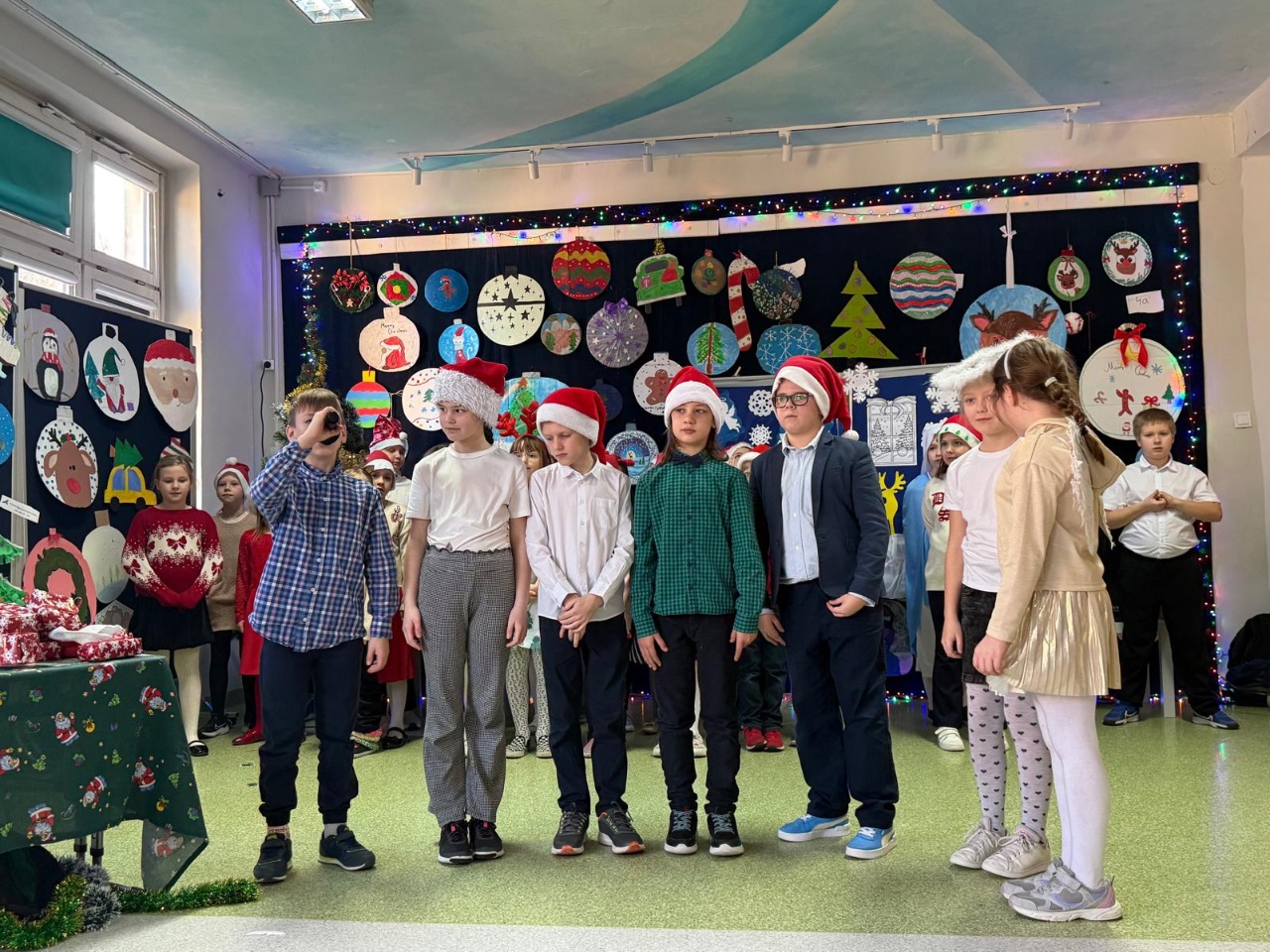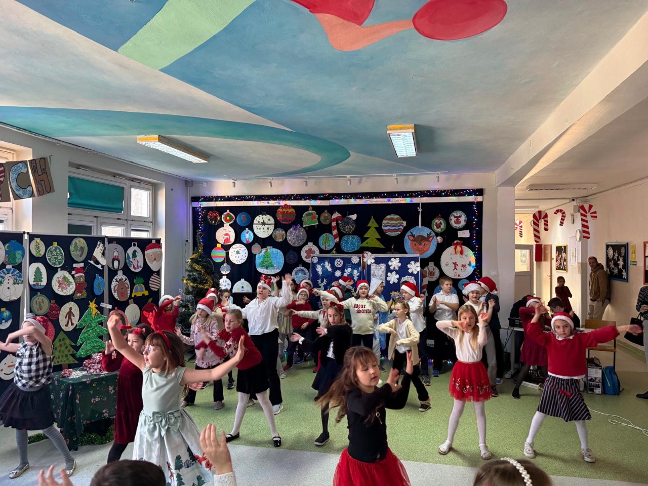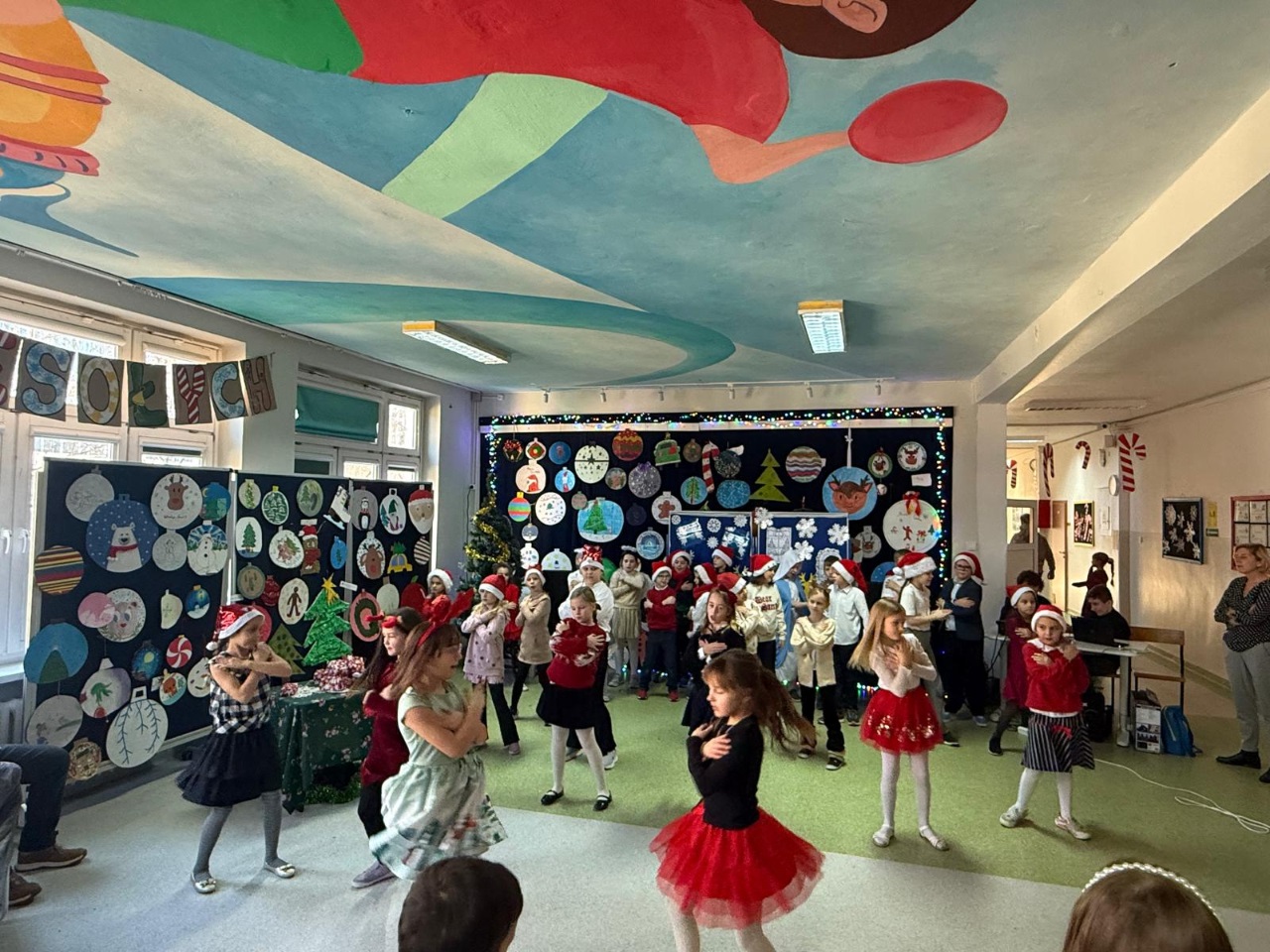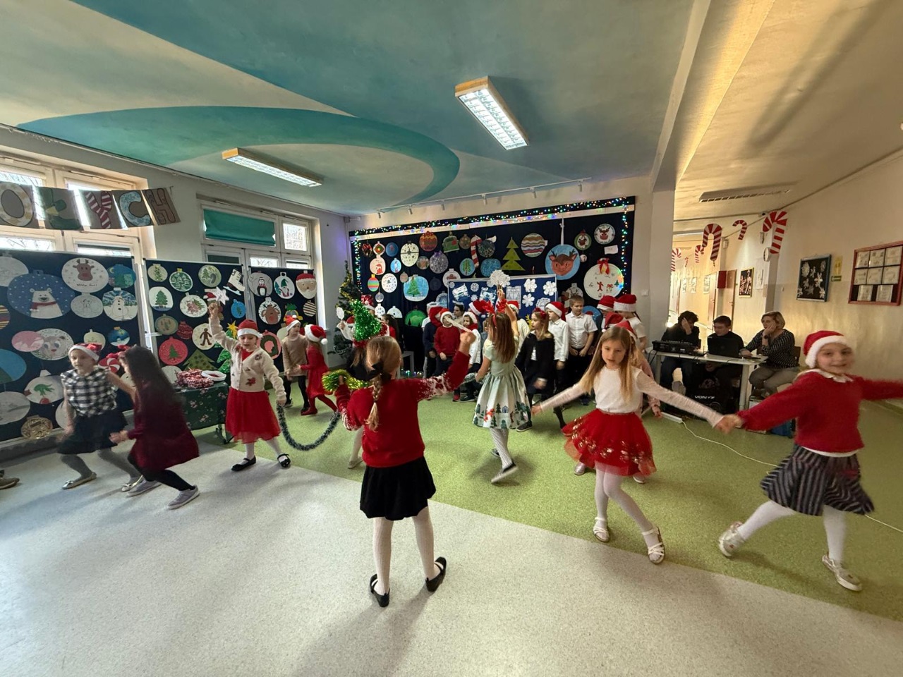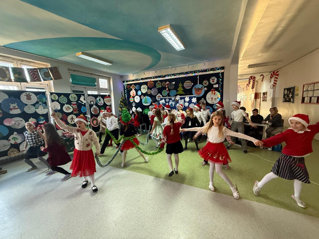 19 grudnia świetlica szkolna przygotowała piękne przedstawienie bożonarodzeniowe dla uczniów klas 1–3 oraz pracowników szkoły. Dzieci z wielkim zaangażowaniem zaprezentowały przygotowany program artystyczny – tańczyły, recytowały wiersze oraz śpiewały, wprowadzając wszystkich w radosny, świąteczny nastrój. Na zakończenie mali artyści złożyli wszystkim obecnym serdeczne życzenia bożonarodzeniowe, które spotkały się z ciepłym przyjęciem i gromkimi brawami.