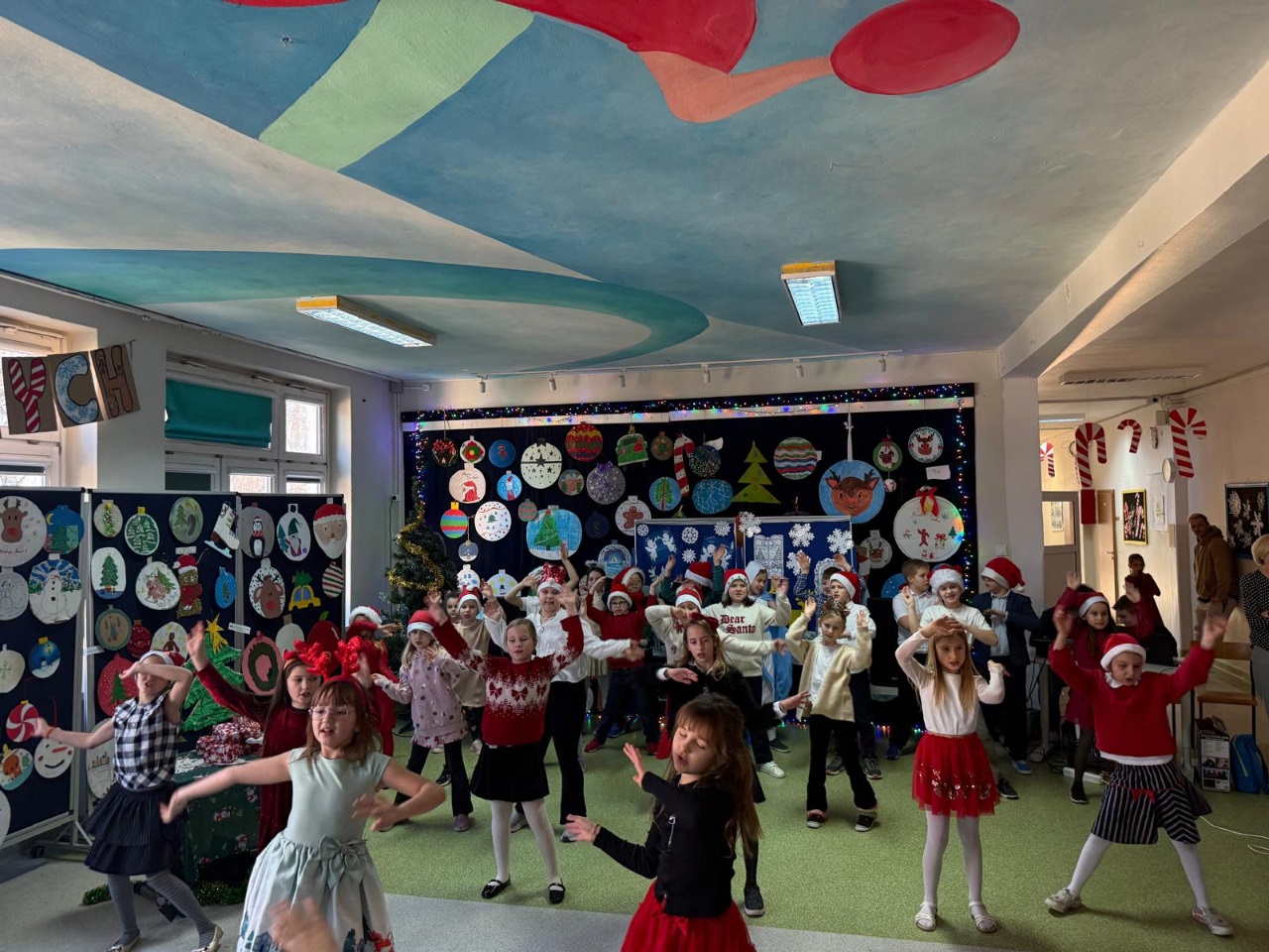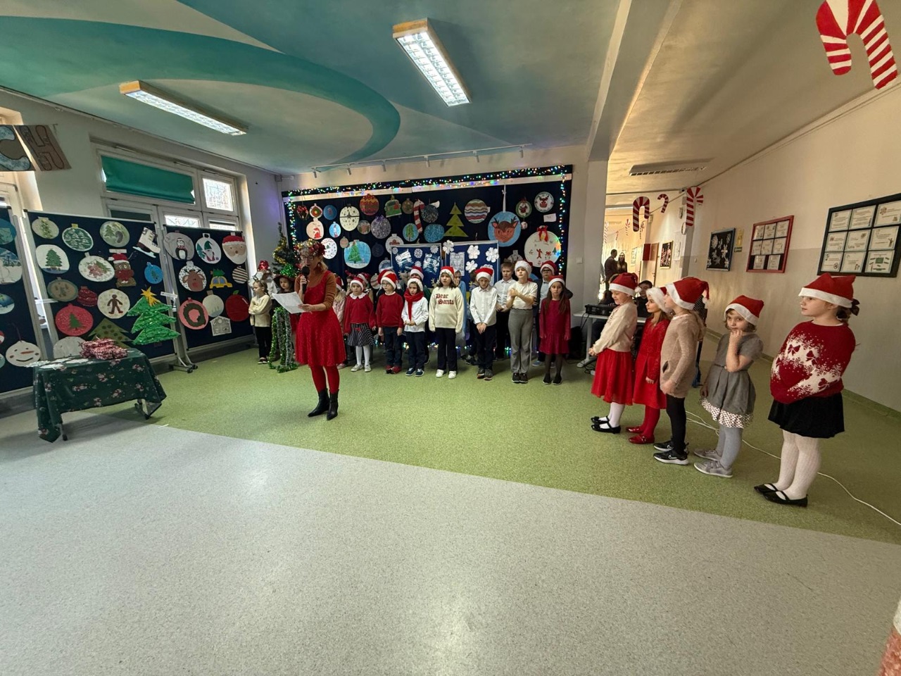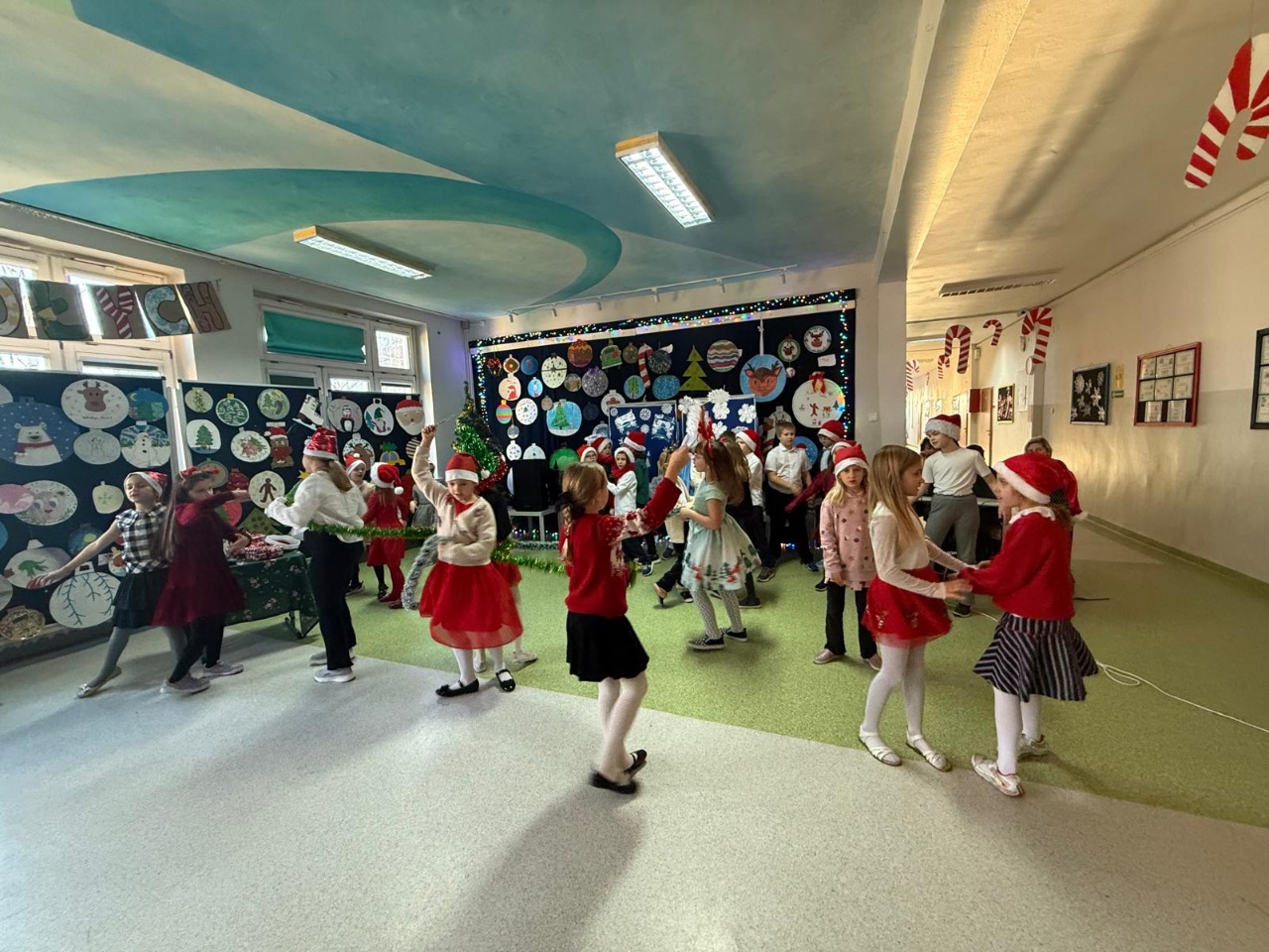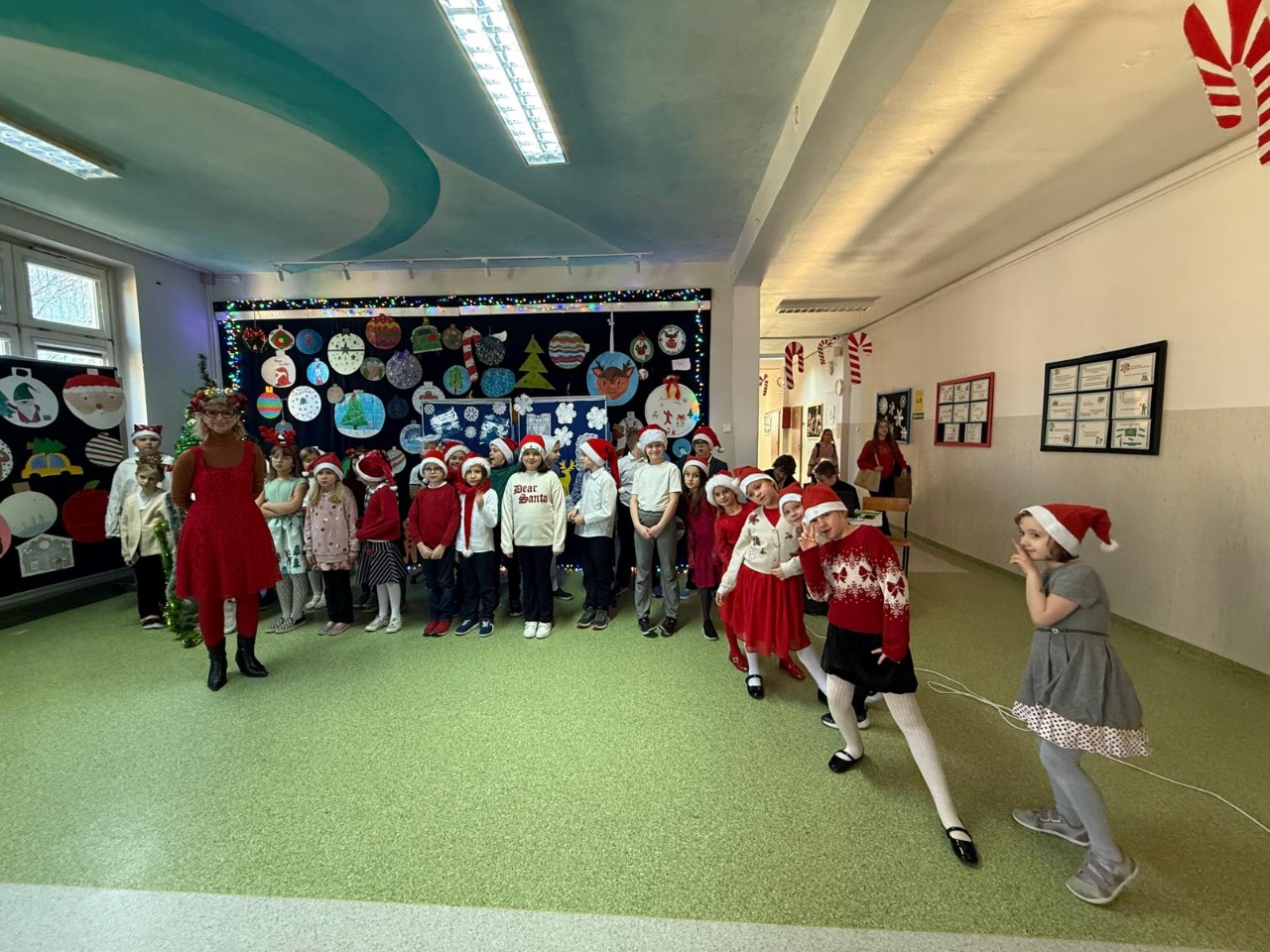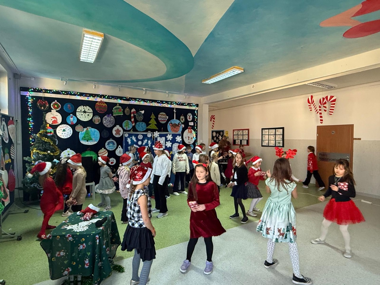 19 grudnia świetlica szkolna przygotowała piękne przedstawienie bożonarodzeniowe dla uczniów klas 1–3 oraz pracowników szkoły. Dzieci z wielkim zaangażowaniem zaprezentowały przygotowany program artystyczny – tańczyły, recytowały wiersze oraz śpiewały, wprowadzając wszystkich w radosny, świąteczny nastrój. Na zakończenie mali artyści złożyli wszystkim obecnym serdeczne życzenia bożonarodzeniowe, które spotkały się z ciepłym przyjęciem i gromkimi brawami.