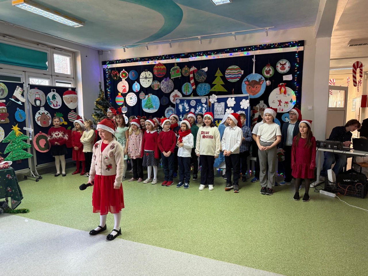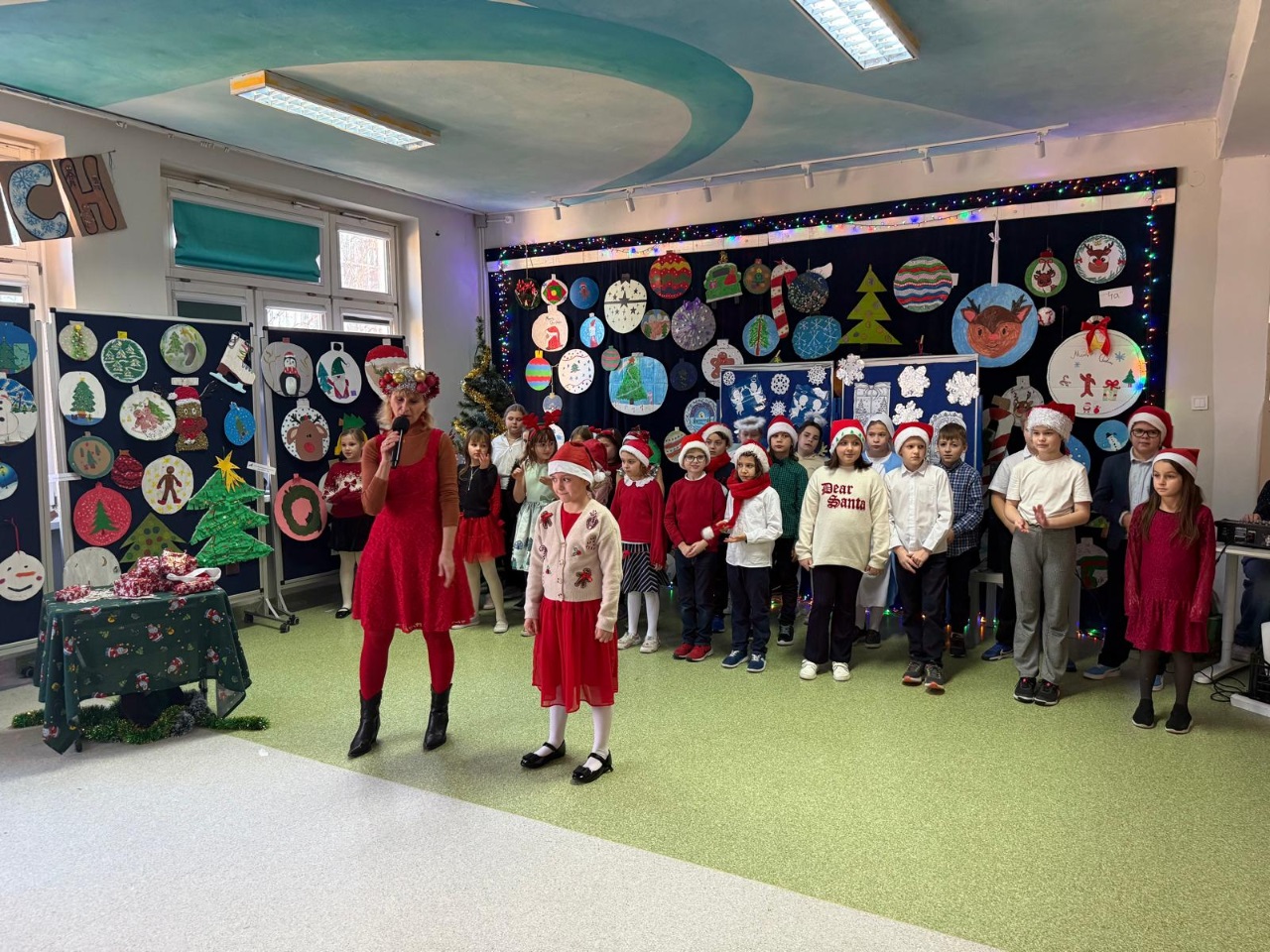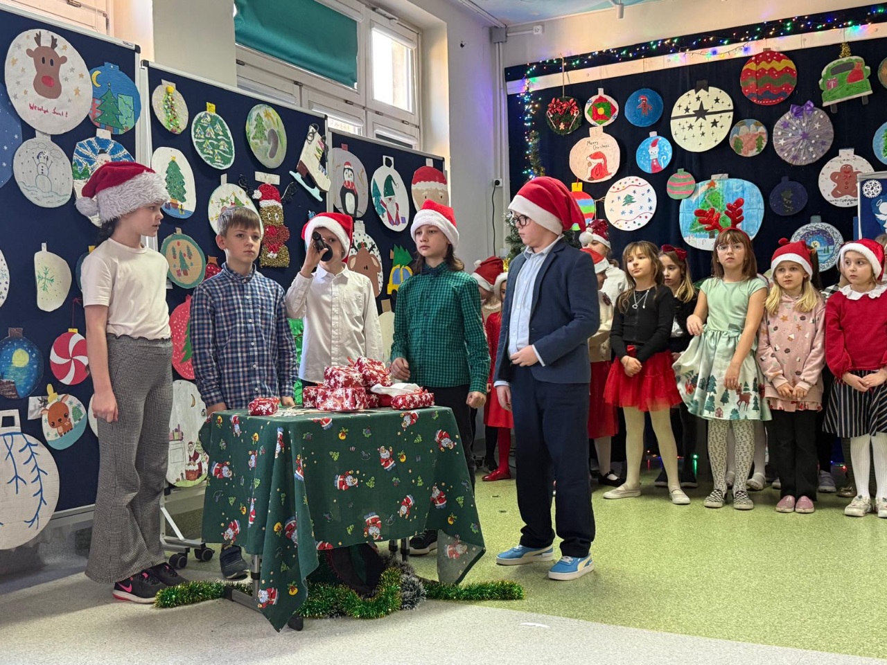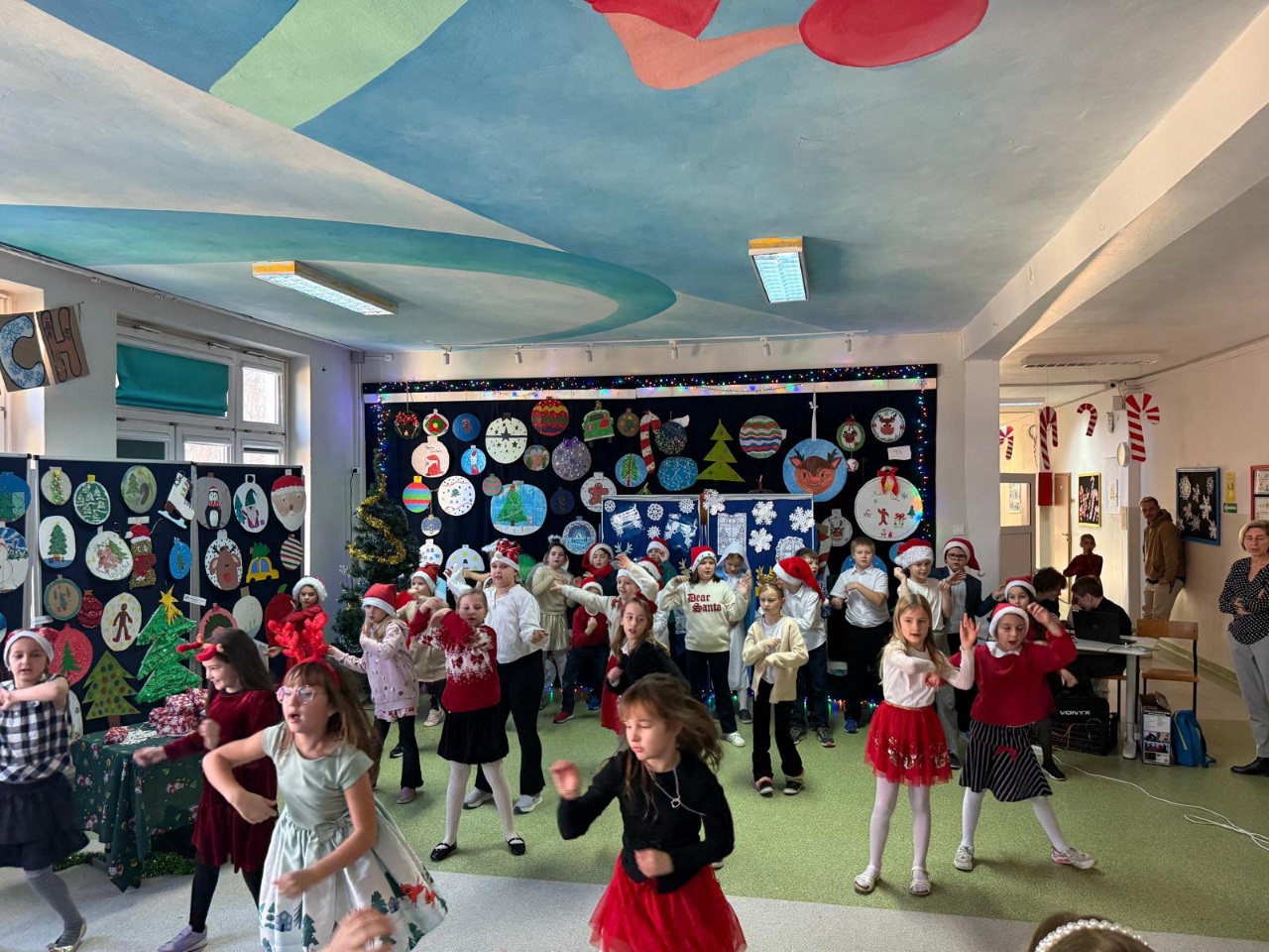 19 grudnia świetlica szkolna przygotowała piękne przedstawienie bożonarodzeniowe dla uczniów klas 1–3 oraz pracowników szkoły. Dzieci z wielkim zaangażowaniem zaprezentowały przygotowany program artystyczny – tańczyły, recytowały wiersze oraz śpiewały, wprowadzając wszystkich w radosny, świąteczny nastrój. Na zakończenie mali artyści złożyli wszystkim obecnym serdeczne życzenia bożonarodzeniowe, które spotkały się z ciepłym przyjęciem i gromkimi brawami.