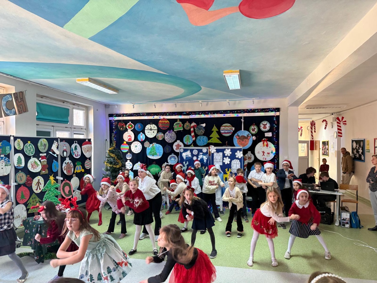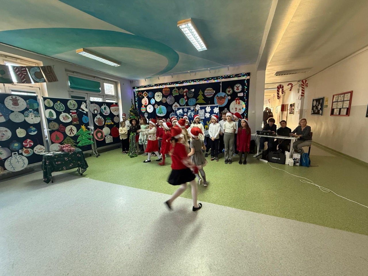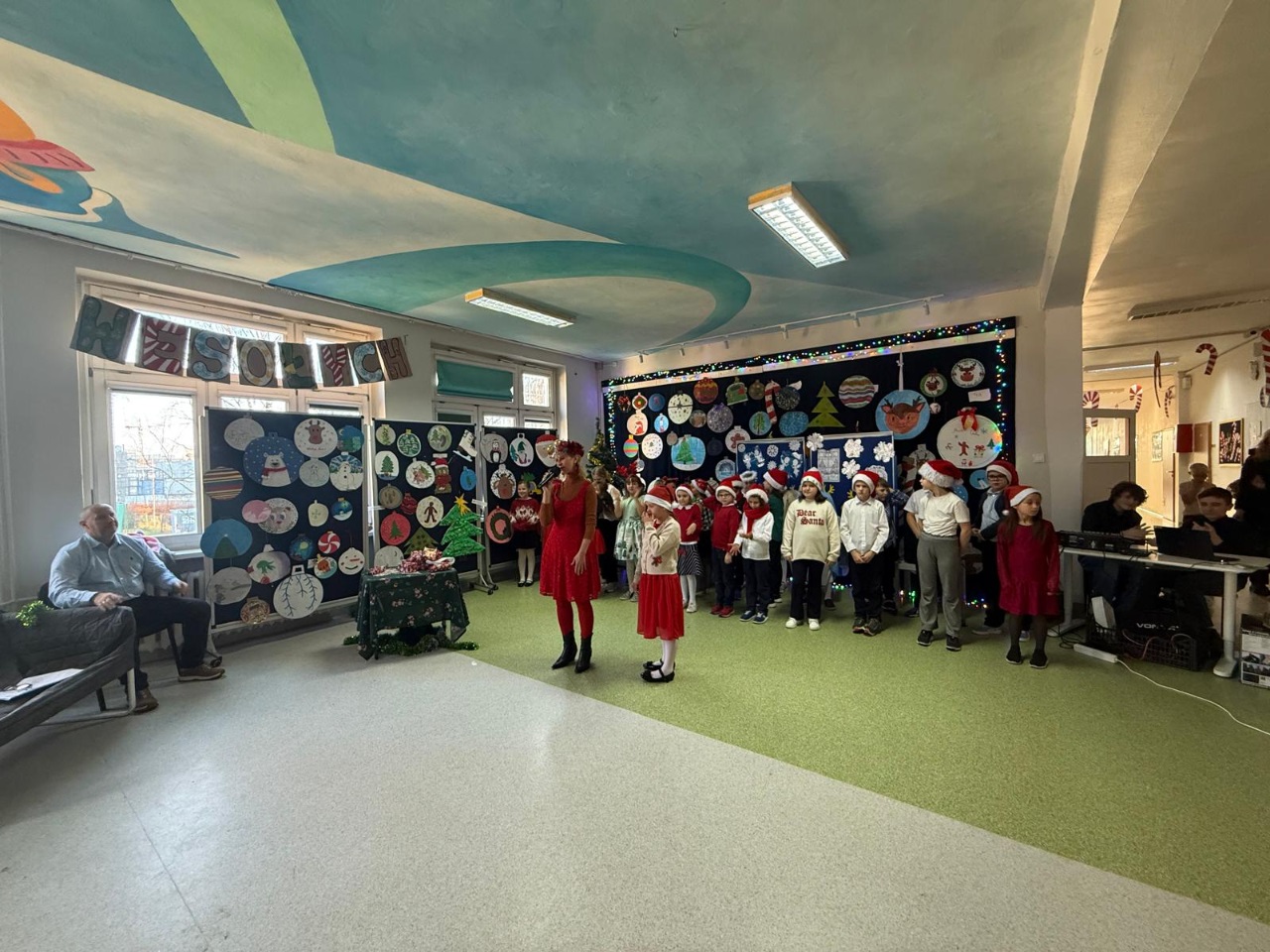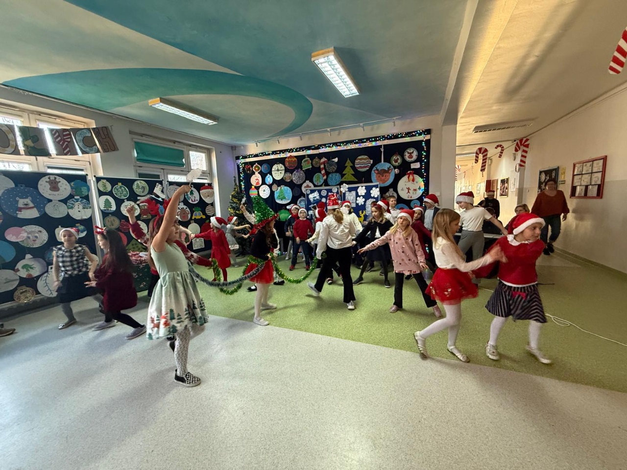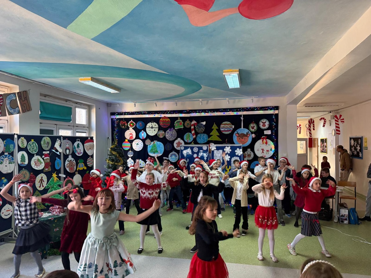19 grudnia świetlica szkolna przygotowała piękne przedstawienie bożonarodzeniowe dla uczniów klas 1–3 oraz pracowników szkoły. Dzieci z wielkim zaangażowaniem zaprezentowały przygotowany program artystyczny – tańczyły, recytowały wiersze oraz śpiewały, wprowadzając wszystkich w radosny, świąteczny nastrój. Na zakończenie mali artyści złożyli wszystkim obecnym serdeczne życzenia bożonarodzeniowe, które spotkały się z ciepłym przyjęciem i gromkimi brawami.