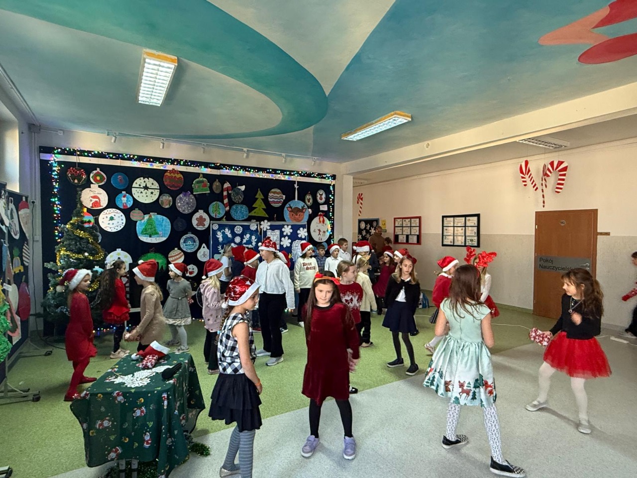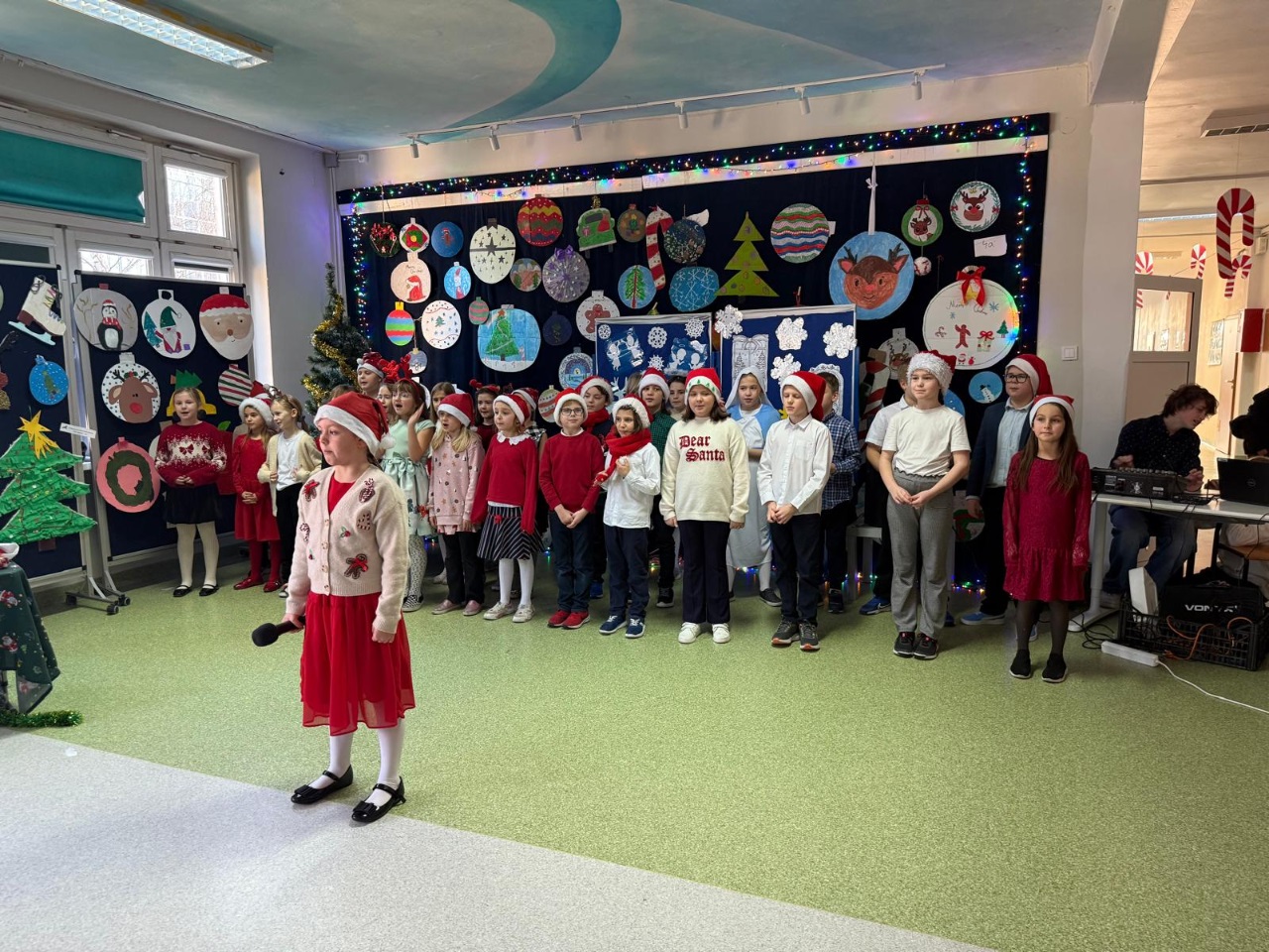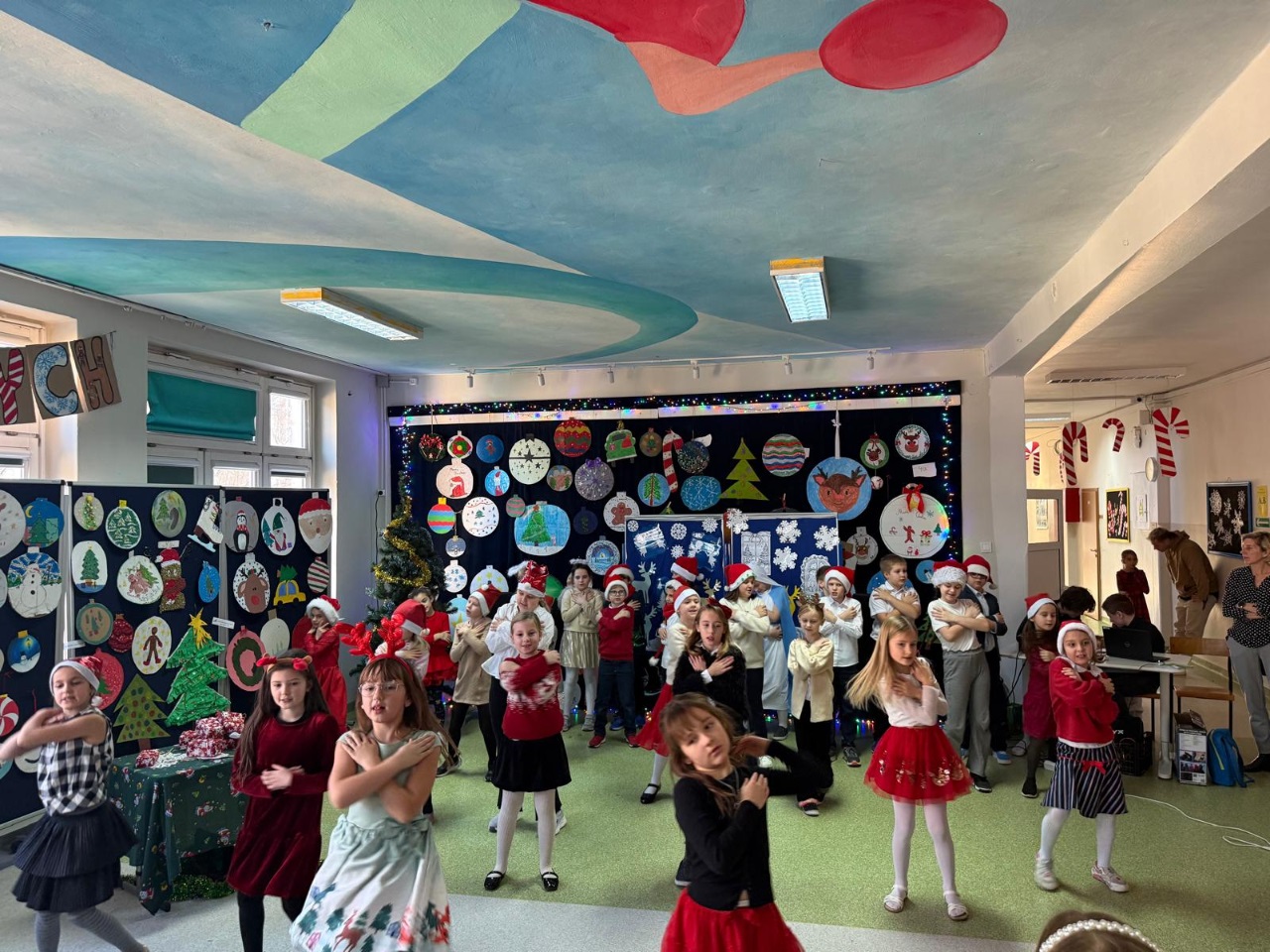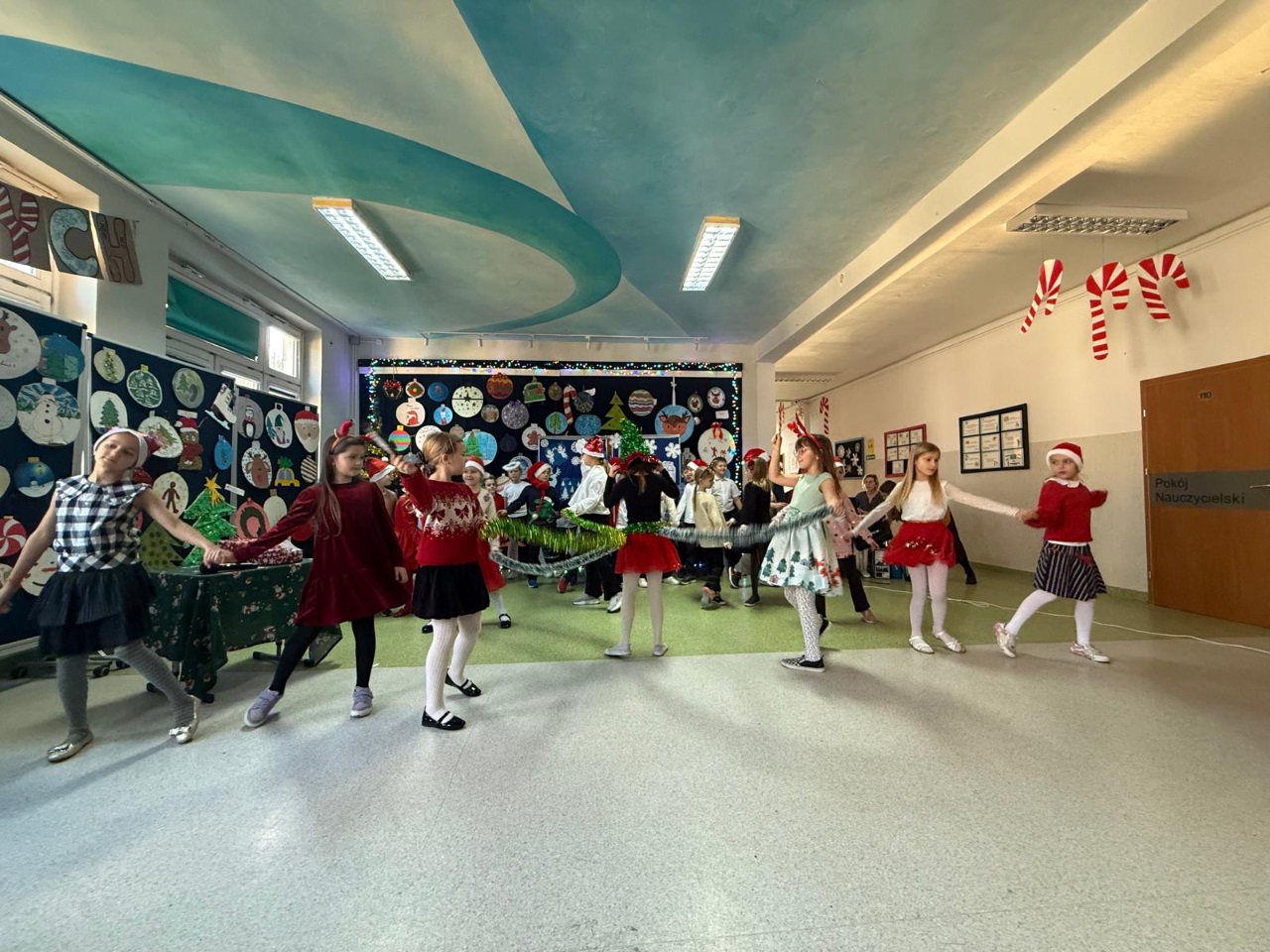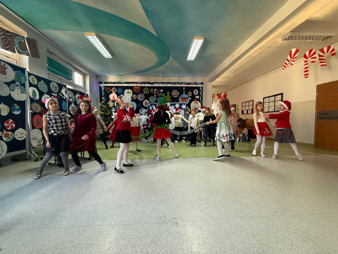 19 grudnia świetlica szkolna przygotowała piękne przedstawienie bożonarodzeniowe dla uczniów klas 1–3 oraz pracowników szkoły. Dzieci z wielkim zaangażowaniem zaprezentowały przygotowany program artystyczny – tańczyły, recytowały wiersze oraz śpiewały, wprowadzając wszystkich w radosny, świąteczny nastrój. Na zakończenie mali artyści złożyli wszystkim obecnym serdeczne życzenia bożonarodzeniowe, które spotkały się z ciepłym przyjęciem i gromkimi brawami.