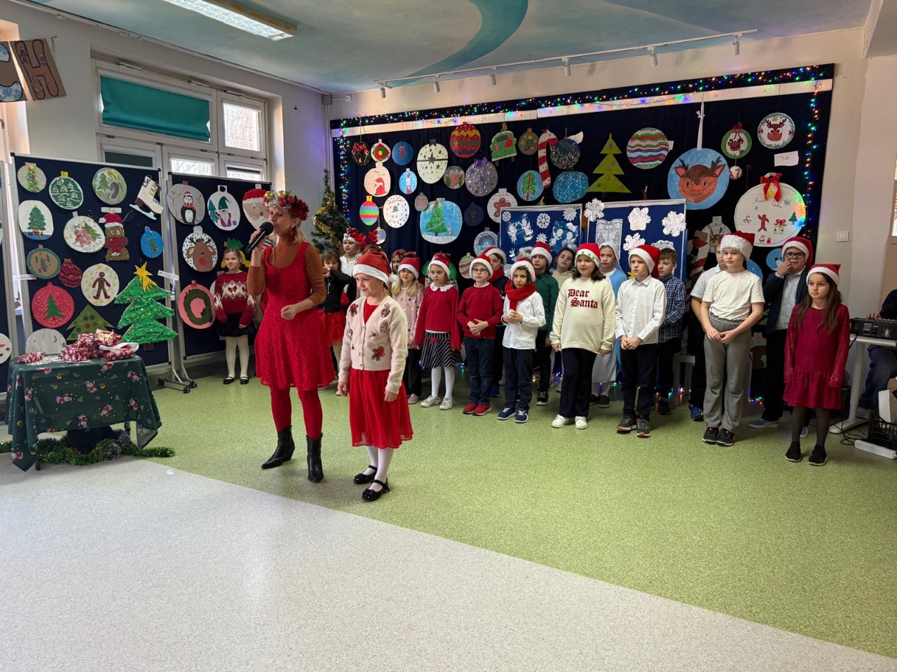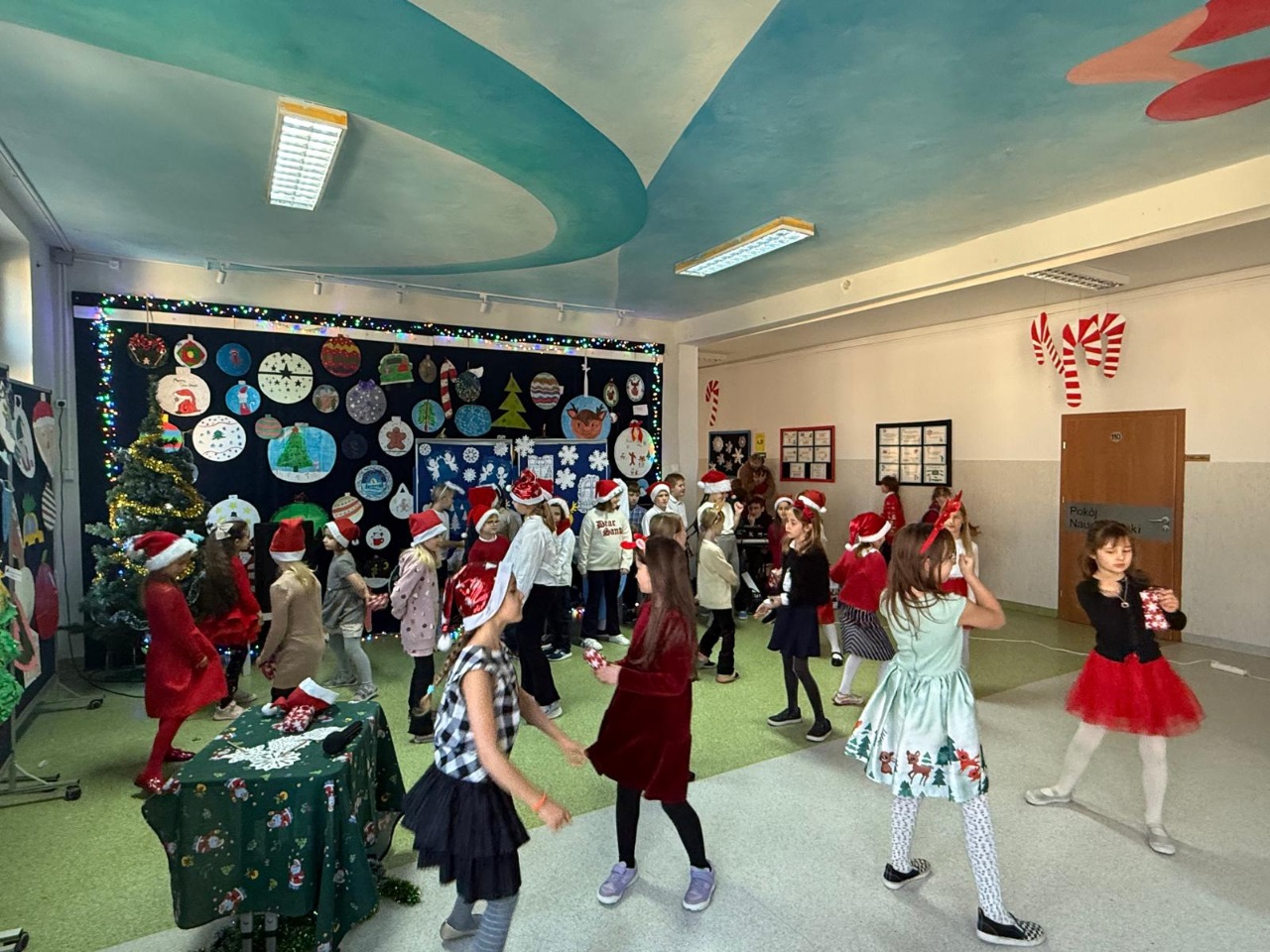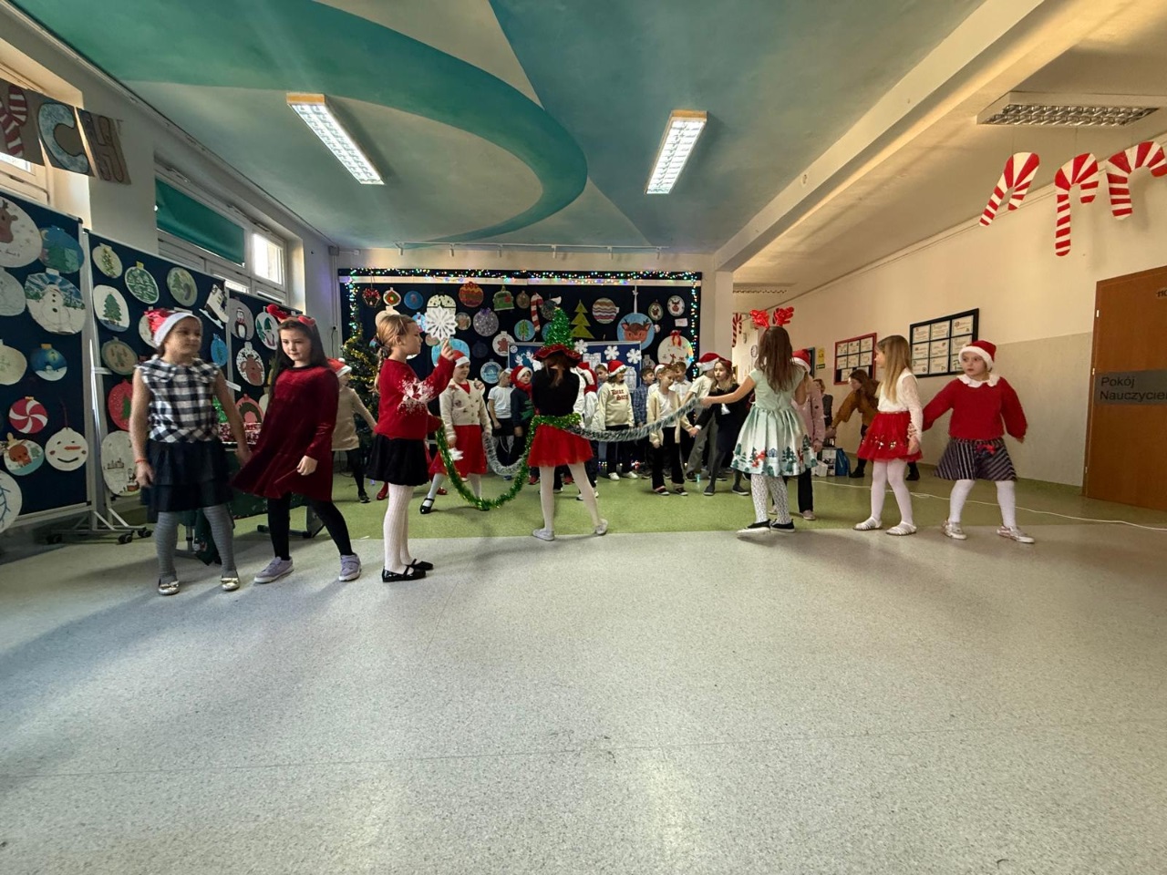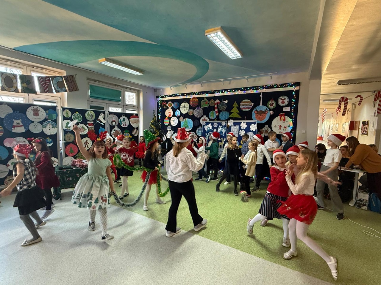 19 grudnia świetlica szkolna przygotowała piękne przedstawienie bożonarodzeniowe dla uczniów klas 1–3 oraz pracowników szkoły. Dzieci z wielkim zaangażowaniem zaprezentowały przygotowany program artystyczny – tańczyły, recytowały wiersze oraz śpiewały, wprowadzając wszystkich w radosny, świąteczny nastrój. Na zakończenie mali artyści złożyli wszystkim obecnym serdeczne życzenia bożonarodzeniowe, które spotkały się z ciepłym przyjęciem i gromkimi brawami.